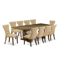 EAST WEST FURNITURE - LAGA11-78-03 - 11-PC DINING ROOM TABLE SETElevate the charm of any dining area with our stylishly designed table set. This 11-piece dining room set features a wooden dining table and 10 matching parsons dining chairs, bringing a touch of simplicity and contemporary elegance to your home. Perfect for kitchen, kitchen, and dining areas, this set comfortably accommodates up to 10 people, making it ideal for family-style dinners and gatherings with friends. The dining table showcases a Distressed Jacobean Rectangular Table Top and Double Pedestal Legs, while the dining chairs boast Brown Linen Fabric Seats and Antique Walnut Hardwood Chair Legs. With a Linen Fabric seat and Button Tufted Back, the dining chairs are accentuated by a wooden frame outlining the back and padded center. Crafted from high-quality Rubberwood, this table set ensures excellent durability and stability. Our team of highly experienced carpenters has meticulously crafted this set, guaranteeing a smooth and top-quality finish. Cleaning this dining table set is effortless, while it consistently exudes an elegant appeal.PRODUCT FEATURES: Material: Asian Hardwood Table Shape: Rectangular Table Top Color: Distressed Jacobean Table Legs Color: Distressed Jacobean Chairs Finish: Antique Walnut Upholstered Material: Linen Fabric Chairs Fabric Color: Brown Chairs Back Style: Button Tufted Back Chair Weight Capacity: 300 lbs Table Dimensions: Length: 92/68; Width: 42; Height: 30. Chairs Dimensions: Length: 23; Width: 18; Height: 36.Include in this Package: 1 Rectangular Table and 10 Parson Dining Chairs.