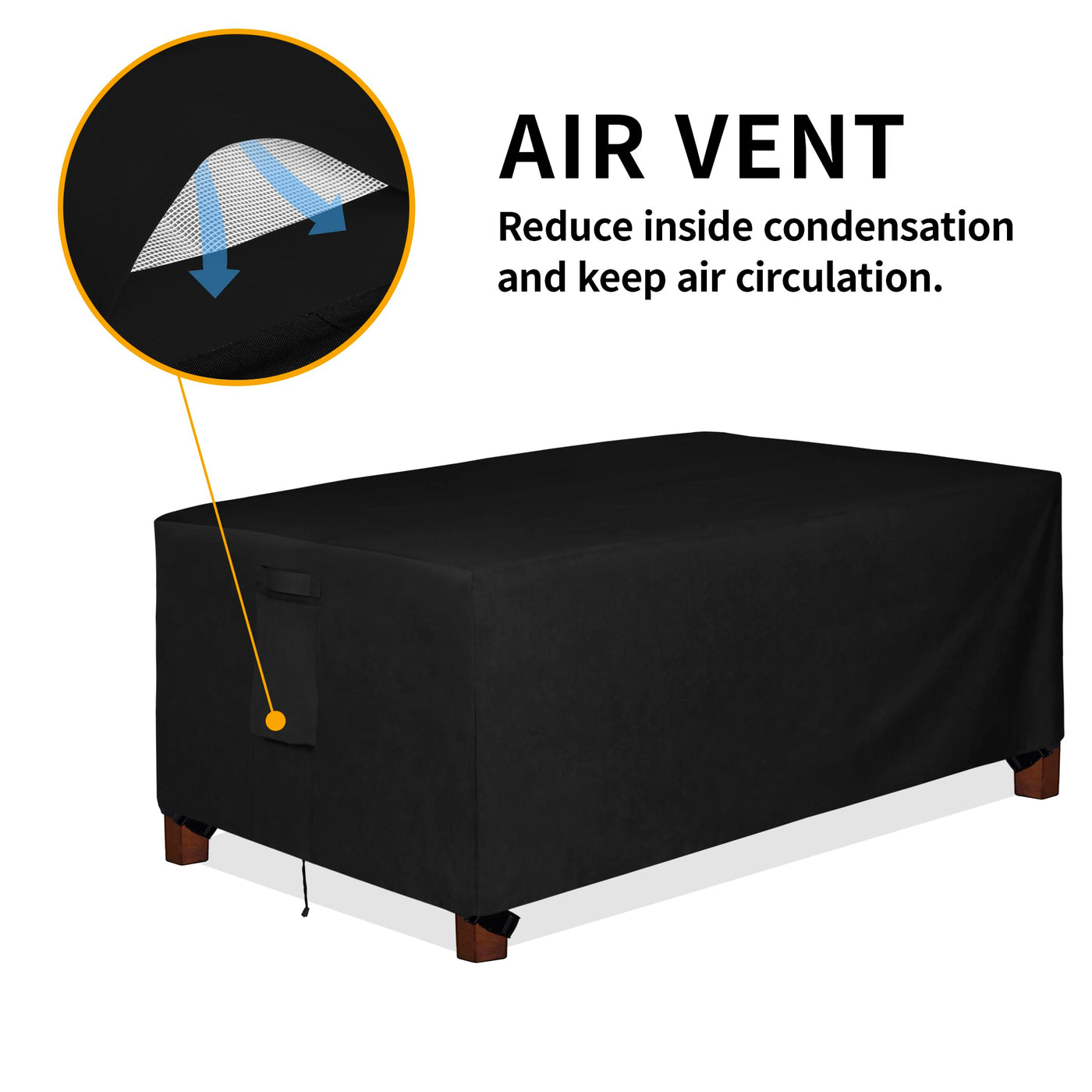 The patio table cover is made of 600D heavy duty oxford fabric with PVC coating back layer. The material is 100% waterproof, UV-Resistant, Weatherproof and Dustproof, offering year-round protection. There are fabric handles at two sides for easy installation and removal. There are four click-close straps at bottom of cover. Fasten them to the furniture feet can prevent the cover blown away by wind. Elastic hem cord with toggle allows for a tight and custom-like fit.The air vent is designed for reducing inside condensation and wind lofting. It is easy to clean, just wipe with water. Do not put it in the wash machine.
