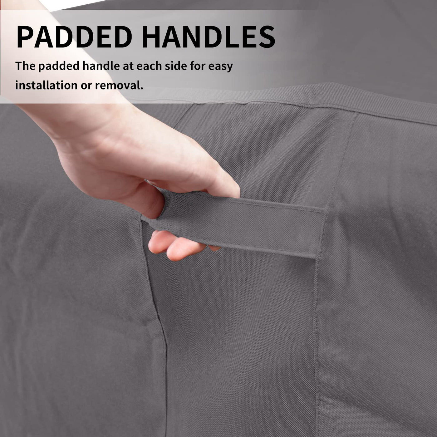 The patio furniture cover is made of 600D heavy duty oxford fabric with PVC coating back layer. The material is 100% waterproof, UV-Resistant, Weatherproof and Dustproof, offering year-round protection. There are fabric handles at two sides for easy installation and removal. There are four quick release buckles at bottom of cover. Fasten them to the furniture feet can prevent the cover blown away by wind. It is easy to clean, just wipe with water. Do not put it in the wash machine.