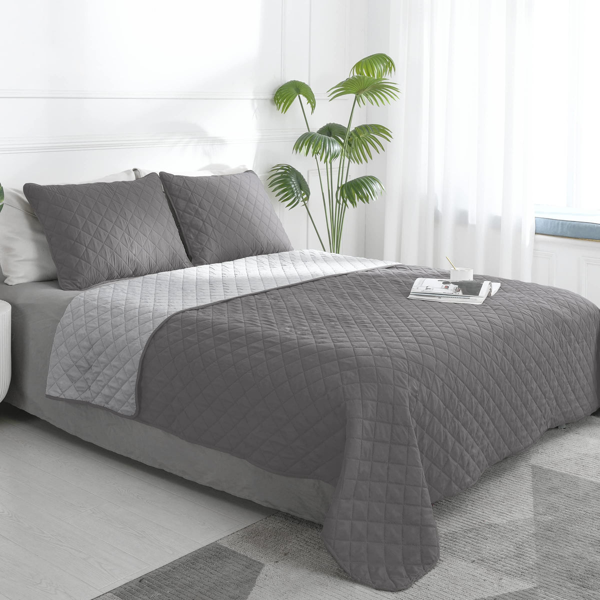 Easy-Going Queen Plus Size Reversible Quilt Set With 1 Quilt And 2 Pillow Shams, Soft Bed Quilt Cover, Water Resistant Lightweight Microfiber Bedspread, Stain Resistant, Gray/Light Gray