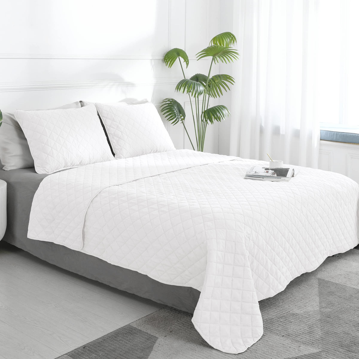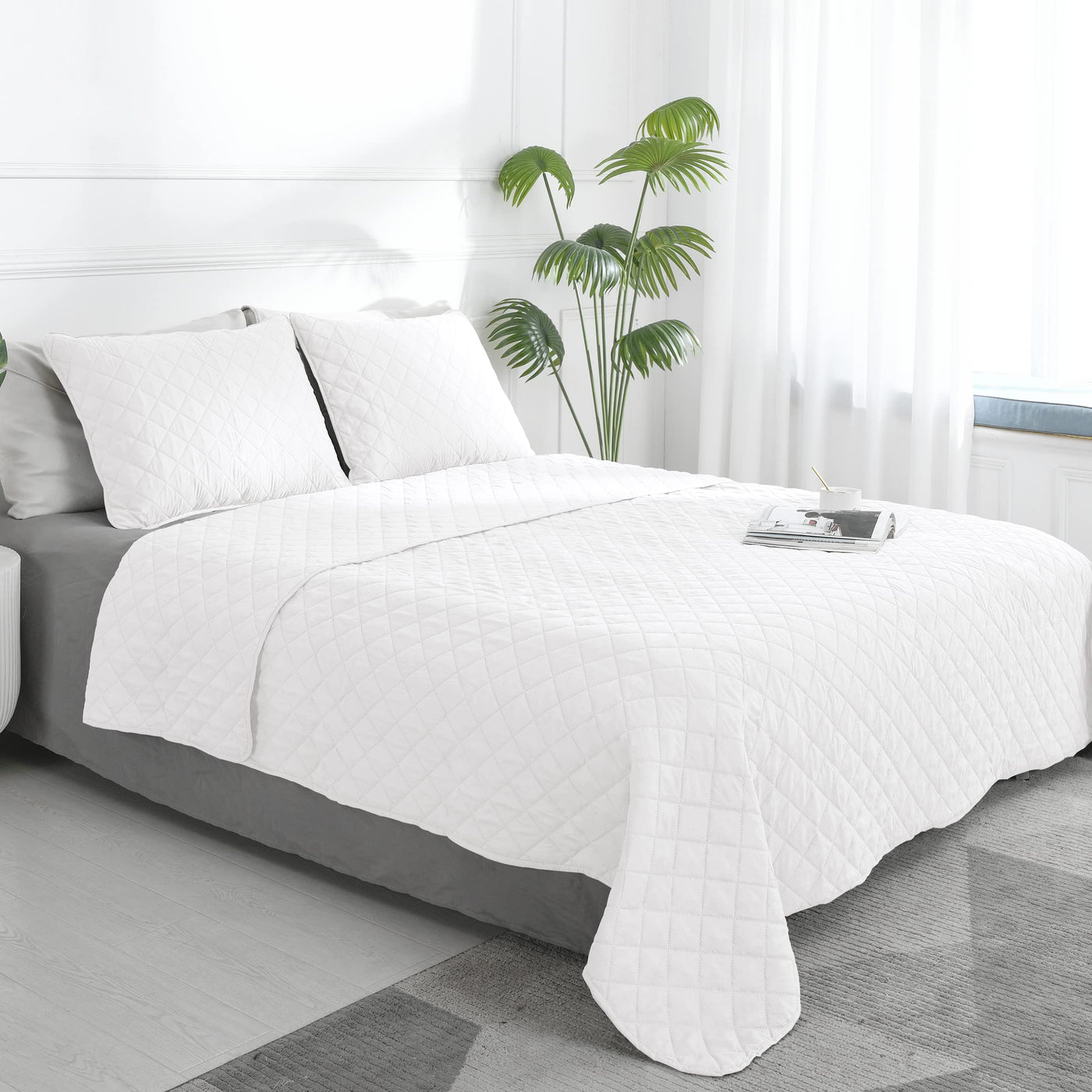Easy-Going Queen Plus Size Reversible Quilt Set With 1 Quilt And 2 Pillow Shams, Soft Bed Quilt Cover, Water Resistant Lightweight Microfiber Bedspread, Stain Resistant, White/White