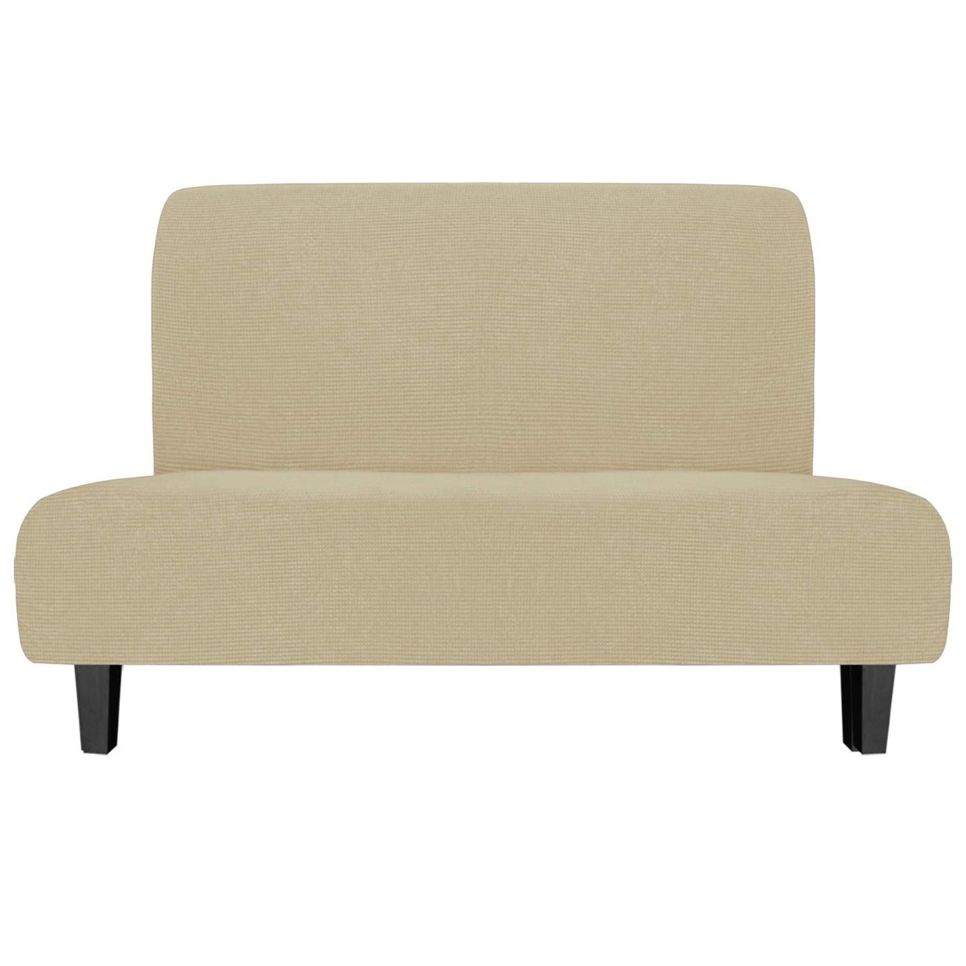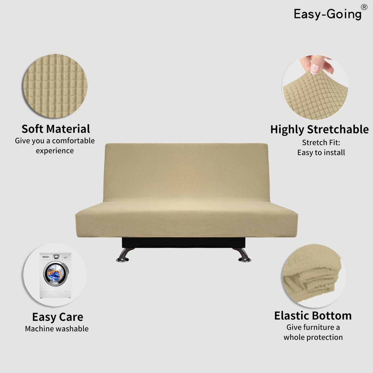 Easy-Going Stretch Futon Slipcover Armless Futon Bed Cover Furniture Protector Without Armrests With Elastic Bottom For Kids, Soft Jacquard Fabric Small Checks (Medium, Beige)