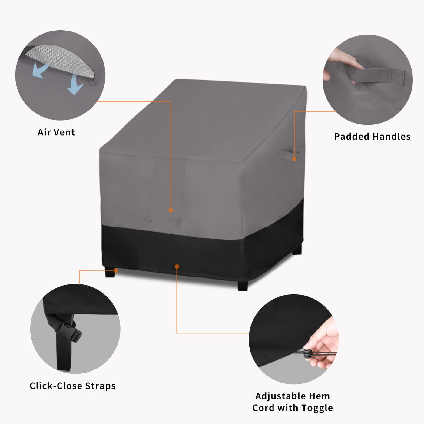 Easy-Going brand household, the factory has been developing and producing high-quality environment-friendly household articles for ten years. The brand's goal: to make homes more comfortable. The patio sofa cover is made of 600D heavy duty oxford fabric with PVC coating back layer. The cove has two combined colors. The material is 100% waterproof, UV-Resistant, Weatherproof and Dustproof, offering year-round protection. There are fabric handles at two sides for easy installation and removal. There are four click-close straps at bottom of cover. Fasten them to the furniture feet can prevent the cover blown away by wind. And there is also elastic hem cord that can be tightened for a perfect fit and prevent from slipping. Air vent can reduce inside condensation and wind lofting.