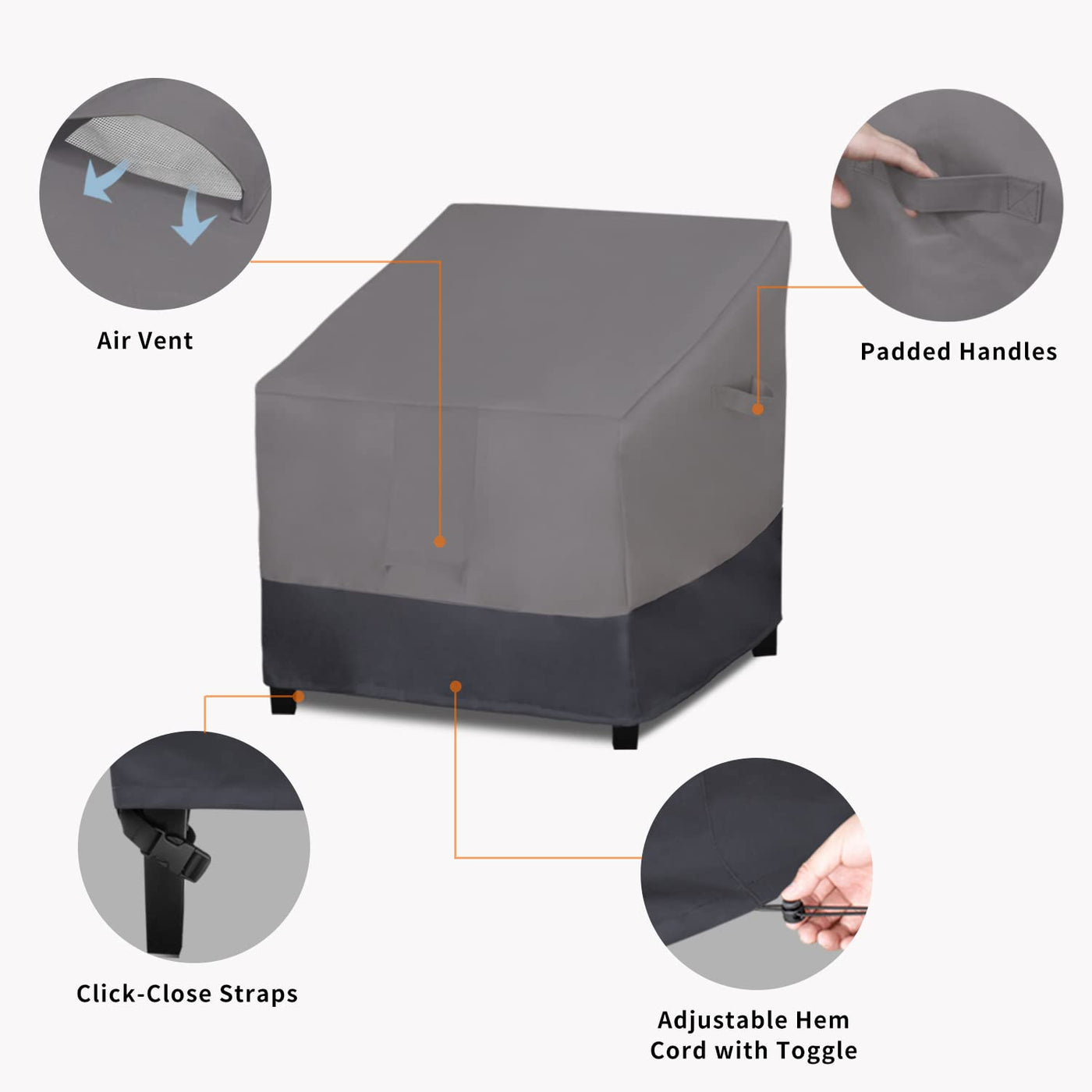 The patio sofa cover is made of 600D heavy duty oxford fabric with PVC coating back layer. The cover has two combined colors. The material is 100% waterproof, UV-Resistant, Weatherproof and Dustproof, offering year-round protection. There are fabric handles at two sides for easy installation and removal. There are four click-close straps at bottom of cover. Fasten them to the furniture feet can prevent the cover blown away by wind. And there is also elastic hem cord that can be tightened for a perfect fit and prevent from slipping. Air vent can reduce inside condensation and wind lofting.