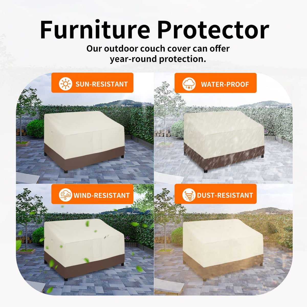 The patio sofa cover is made of 600D heavy duty oxford fabric with PVC coating back layer. The cover has two combined colors. The material is 100% waterproof, UV-Resistant, Weatherproof and Dustproof, offering year-round protection. There are fabric handles at two sides for easy installation and removal. There are four click-close straps at bottom of cover. Fasten them to the furniture feet can prevent the cover blown away by wind. And there is also elastic hem cord that can be tightened for a perfect fit and prevent from slipping. Air vent can reduce inside condensation and wind lofting.