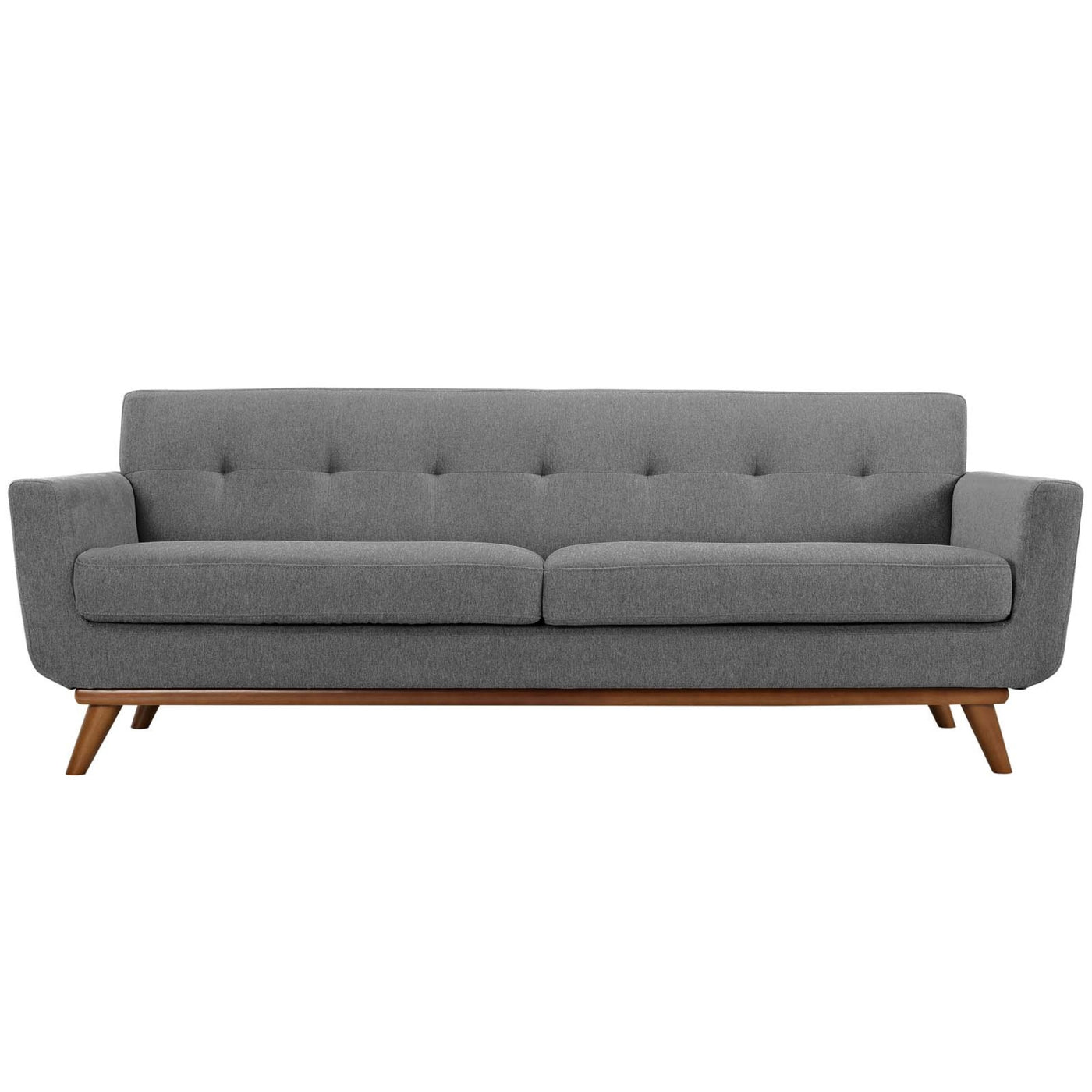 The Engage sofa is designed with gently sloping curves and large dual cushions, making it the perfect spot for lounging. Whether you're unwinding after a long day, enjoying a cup of coffee and brunch, or engaging in lively conversations with friends, this sofa will be a welcomed addition to your home. The seven tufted buttons add a visually appealing touch, bringing depth to your seating decor. The sofa is supported by four cherry color rubberwood legs and frame, providing a sturdy foundation for the comfortable upholstered material. This set includes one Engage Sofa with wood legs.