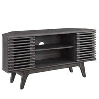 Introducing the Ergode 46'' Corner TV Stand, a perfect combination of mid-century charm and modern practicality. This stand is expertly crafted with a sleek walnut grain veneer, giving it a touch of elegance. It boasts four sturdy solid wood tapered legs and non-marking foam foot pads for added stability. The adjustable shelves and two slatted sliding doors provide ample storage space for all your media essentials. Additionally, it features a cable management hole to keep your wires organized and tidy. With its slanted sides, it can accommodate TVs up to 50''. Assembly is required. Elevate the style of your living room, lounge, or recreation area with the contemporary linear design of the Ergode TV stand.