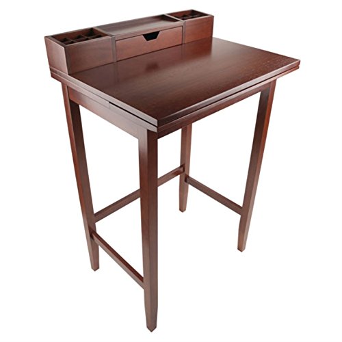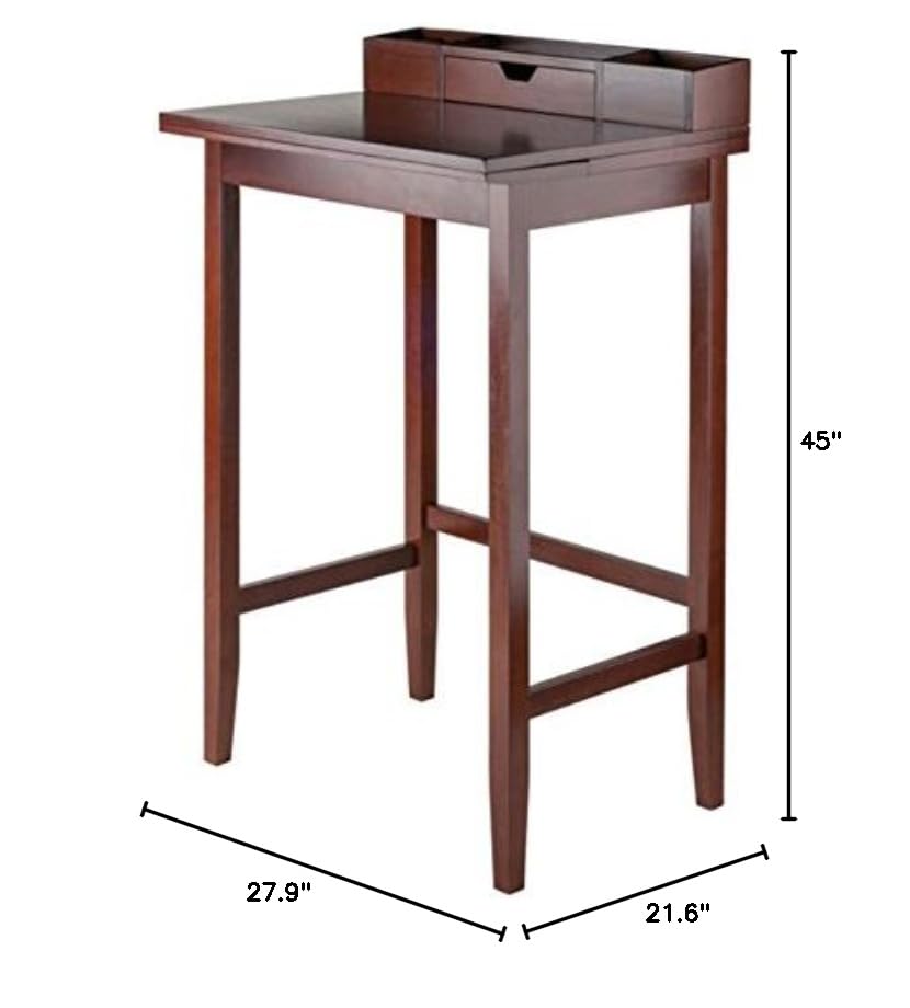 Introducing the Archie High Desk, a stunning piece inspired by early American antiques. This desk combines classic charm with modern functionality, featuring a slide-out top that can be used as a standing desk or paired with a bar stool for comfortable seating. Whether you're reading mail, jotting down notes, or working on your laptop, the extended space provides ample room. Perfect for the office, kitchen, or as an additional workspace, this desk's elegant simplicity will elevate any room. Crafted from durable solid wood and finished in a rich Walnut, it boasts a hutch with a center drawer for pens, pencils, and stamps, as well as two side wells for writing accessories. The desk's overall dimensions are 45'H x 27.9'W x 21.6'D. The front expansion effortlessly slides out and is self-supported, creating a spacious and seamless desktop. The tapered legs, along with rear and side cross-bars, enhance stability. Additionally, a set of dividers is included for use in the side wells. Assembly is required. With the hutch installed, the top surface measures 27.9'W x 16.5'D, and with the top expanded, it measures 27.9'W x 16.5'D. Without the hutch, the top surface measures 27.9'W x 21.6'D, and with the top expanded, it measures 27.9'W x 29.5'D. The inside drawer dimensions are 11.8'W x 3.3'D x 2.2'H, while the inside dimensions of each side well are 6.3'W x 3.8'D x 3.9'H. When the divider is in place, each slot measures 2'W x 1.8'D. The center shallow well measures 12.8'W x 3.8'D x 0.4'H. The desk ships in one box with dimensions of 27.95'W x 21.65'D x 45.04'H and weighs 40.79 pounds.