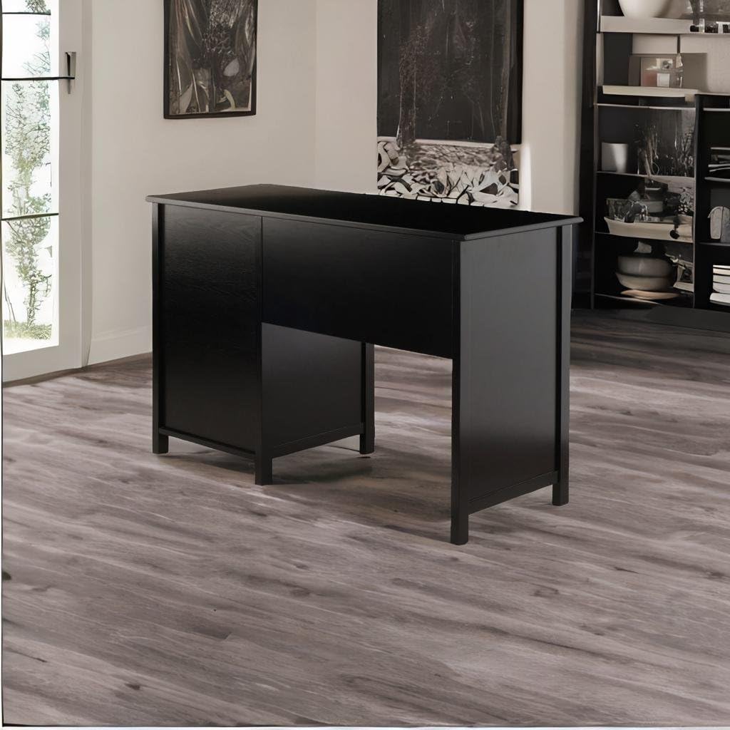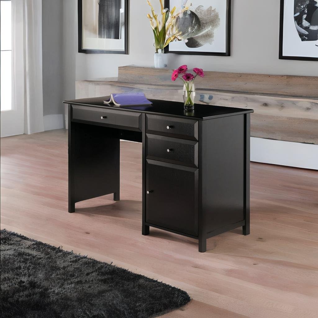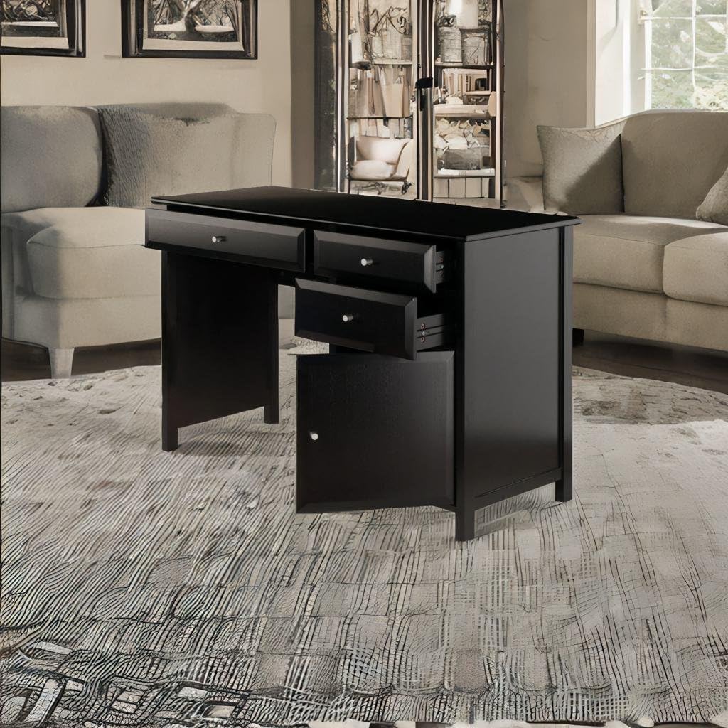 The Ergode Delta Writing Desk offers a contemporary, polished look for your workspace. A perfect complement to any decor, use it in your in-home office, dorm room or den to catch up with paperwork. The desk features a cabinet and three soft-close drawers that glide on metal rails. Keep smaller office supplies like pens, pads, and staplers organized and handy in the two smaller side drawers. The larger drawer is perfect for storing a laptop, tablet or other smart gadgets. The larger cabinet door opens up providing ample spaces for office supplies and more. Constructed of sturdy composite wood in black with a silver accent knobs that gives this multifunctional desk a handsome, yet understated look. Create a relaxed setting by completing your office space with the additional items from the Ergode Delta collection (each sold separately). Constructed of sturdy of composite wood. Conveniently packed and shipped in 1 box, that includes the hardware necessary for assembling. Replacement part request can be submitted directly to the manufacturer within 60 days from date of purchase.Overall dims: 30.7H x 47.2W x 20.2DLeg clearance: 26.2"W x 25.2"HLarge drawer (interior) dims: 24"W x 15.1"D x 2.75"HSmall drawer (interior) dims: 13.9"W x 15.1"D x 2.75"H eachCabinet (interior) dims: 16.6"W x 17.4"D x 15.2"HShips in 1 box . Dimension: 47.24" W x 20.24" D x 30.71" H, Weight: 84.33