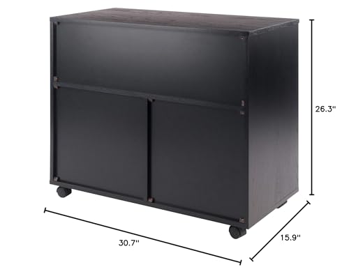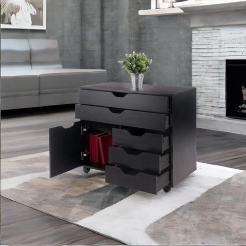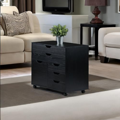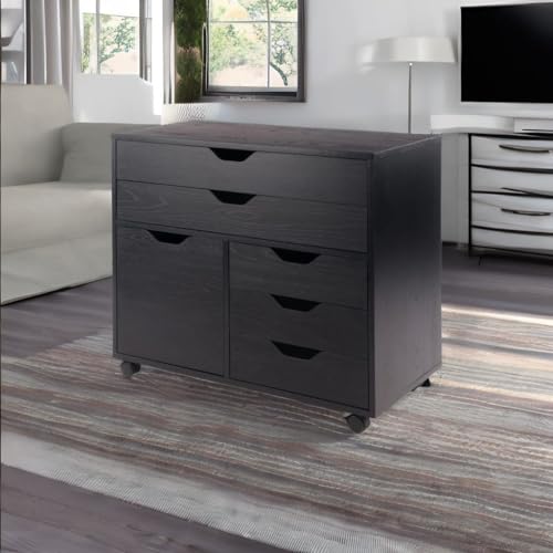 Introducing the Ergode Halifax 3-Section Mobile Storage Cabinet, a versatile and sleek solution for all your storage needs. This cabinet is perfect for organizing knitting, sewing, or craft supplies, as well as tools and sports gear in the garage, mud room, or shed. It features five gliding drawers with cut-out handles, offering easy access to your items. The large drawers are great for storing artwork, maps, or clothing, while the smaller drawers provide additional storage space. The side cabinet is designed for taller items like boots or backpacks. Equipped with five wheels, two of which can be locked, this cabinet ensures stability. Made of sturdy composite wood with a contemporary black finish, it seamlessly blends with any decor. You can also combine it with other organizers from the Ergode Halifax collection for more storage options. The cabinet requires assembly and ships in one box. If needed, replacement parts can be requested from the manufacturer within 60 days of purchase. Its overall dimensions are 26.3"H x 30.7"W x 15.9"D, with a static weight capacity of 35 lbs for the top surface. The large drawers have interior dimensions of 27.5"W x 11.7"D x 2.56"H, with a static weight capacity of 15 lbs. The smaller drawers have interior dimensions of 13.2"W x 11.7"D x 2.5"H, with a static weight capacity of 12 lbs. The cabinet itself has interior dimensions of 13.7"W x 14.7"D x 13.6"H, with a static weight capacity of 25 lbs.