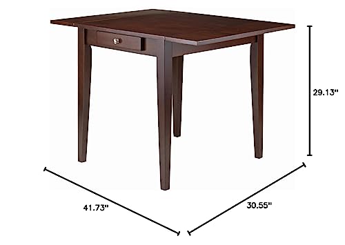 The Ergode Wood Hamilton Drop Leaf Table is a versatile and durable addition to any home. Made of solid wood with a rich walnut finish, it complements any decor. The drop leaf design offers flexibility, making it perfect for small spaces. When raised, it provides ample surface area for entertaining or seating four comfortably. Lowering the leaves creates a compact table, saving floor space. The table features a centered drawer for convenient storage and comes with a satin nickel drawer pull. It pairs well with Ergode dining chairs (sold separately). The table is shipped in one box with all necessary hardware for easy assembly. Replacement parts can be requested from the manufacturer within 60 days of purchase. Dimensions: 41.73" W x 30.55" D x 29.13" H, Weight: 44.45 lbs.