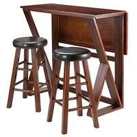 The Harrington Drop Leaf High Table is a perfect choice for gatherings and dinners. It features a drop leaf extension, providing a surface area of 39.37"W x 15.75"D. With the leaf down, the table dimensions are 39.37"W x 16.59"D x 36.22"H. When fully extended, the table size becomes 39.37"W x 31.50"D x 36.22"H. This set includes two 24" Marta Stools with a round seat made of Black Faux Leather and solid wood legs. The stools come fully assembled. The table is constructed from solid wood with a warm Walnut Finish. Assembly is required for the table, which weighs 45.05 pounds and measures 39.37" W x 31.5" D x 36.22" H.