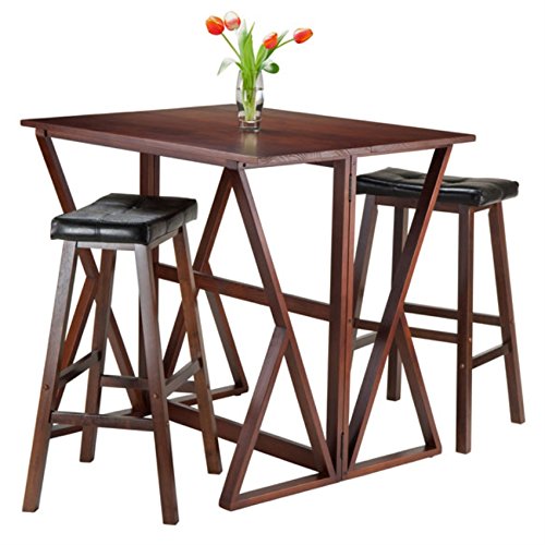 Ergode Harrington Drop Leaf High Table Set - 29-Inch Walnut Finish - Space-Saving Design, Swinging Gate Leg, Includes 2 Cushion Bar Stools - Perfect for Kitchen or Dining - Solid Wood, Easy Assembly