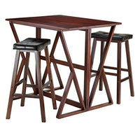 The Ergode Harrington Drop Leaf High Table Set is the perfect solution for small spaces and multifunctional needs. Crafted with solid wood in a warm walnut finish, this table set brings both style and functionality to your home. The unique drop leaf design allows you to extend the table when you need more space or fold it down to save space. Supported by a sturdy swinging gate leg, the table remains stable and secure in both positions. Ideal for kitchens, dining areas, or as an extra table around the house, the Harrington Drop Leaf High Table can adapt to your needs. When fully extended, the table measures 39.37 inches wide by 31.50 inches deep by 36.22 inches high, providing ample space for meals, work, or crafts. When closed, it measures a compact 39.37 inches wide by 16.59 inches deep by 36.22 inches high, making it perfect for smaller rooms or apartments. The set includes two cushion bar stools, each measuring 17.93 inches wide by 15.83 inches deep by 29.69 inches high, with a comfortable seat dimension of 17.48 inches by 10.8 inches deep. The stools are designed to complement the table, providing a cozy and stylish seating option for you and your guests. Assembly is required, but the straightforward instructions and provided hardware make it a hassle-free process. The durable construction ensures that this table set will be a lasting addition to your home. For easy maintenance, simply wipe with a damp cloth to keep it looking new. Enhance your living space with the Ergode Harrington Drop Leaf High Table Set. Its transitional style and practical design make it a versatile piece that will fit seamlessly into any home decor. Whether you're enjoying a meal, working on a project, or entertaining guests, this table set offers the perfect blend of form and function.