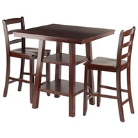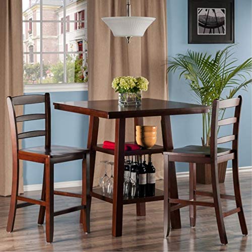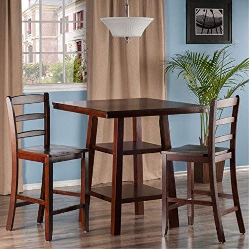 The 3-piece Orlando High Table and Ladder Back Stool Set combines simplicity and function, reminiscent of a country home antique. The set is a great addition to a dining area, eat-in kitchen, or family room for cards and board games.Or pull up one of the stools and use the table as a desk or workspace. The table features 2 shelves that offer generous storage space for dishes, glassware, and other dining accessories. The solid wood Ladder Back Stools give the set a warm and homey character. Finished in a rich Walnut, the table is made of solid and composite wood for long-lasting stability. Overall table size is 33.8"W x 33.8"D x 36"H. The Orlando High Table features two open shelves with corner cut outs for secure construction and a handcrafted look. The slightly flared legs provide added stability. The edges of the table top are gently rounded. The 24"H stools have curved backs and molded seats for comfort and tuck easily under the table to save space. Assembly required. Overall table size is 33.8"W x 33.8"D x 36"H Top shelf is 17.1"W x 17.1"D(14.1" from inner leg to inner leg) Lower shelf is 19.1"W x 19.1"D(16.1" from inner leg to inner leg) Stools are 24"H Ships in 2 boxes . Dimension: 33.86" W x 33.86" D x 36.06" H, Weight: 52.91
