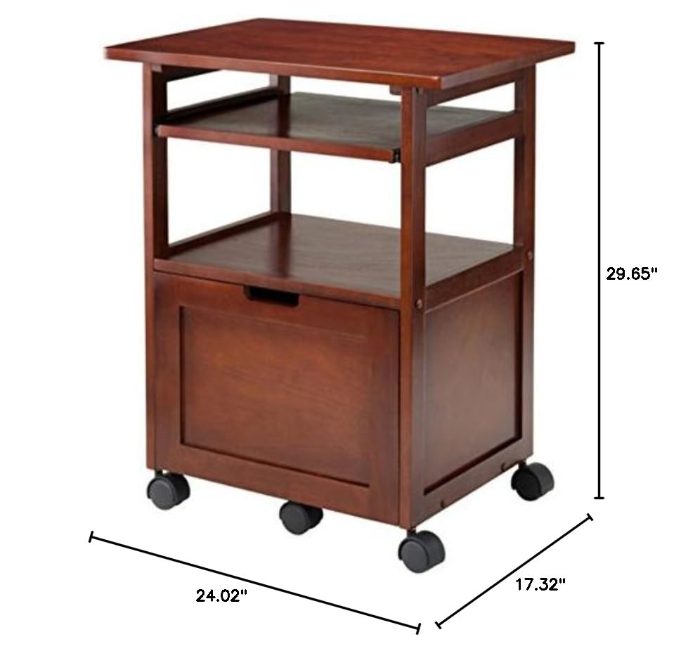 Introducing Piper, a versatile and compact workplace or storage solution designed to enhance productivity and flexibility. This multipurpose unit features a pullout tray that can serve as a laptop stand or storage for office essentials, along with a spacious lower shelf for larger items. The pullout drawer offers convenient organization for important papers and can be used as a filing cabinet or general storage. With an additional caster for support, the bottom drawer measures 16"W x 13"D x 11"H. The table top dimensions are 24.1"W x 17.4"D, while the pullout tray measures 16.9"W x 15.4"D with a clearance of 4"H. The shelf provides ample space with dimensions of 17.8"W x 15.4"D and a clearance of 7.9"H. The filing cabinet can accommodate letter size folders, with a distance of 12.2" between metal rods and a 10.2" distance from the rod to the bottom of the drawer. Crafted from a combination of solid and composite wood in a walnut finish, Piper requires assembly. Its overall dimensions are 24.02" W x 17.32" D x 29.65" H, and it weighs 34.8 pounds.