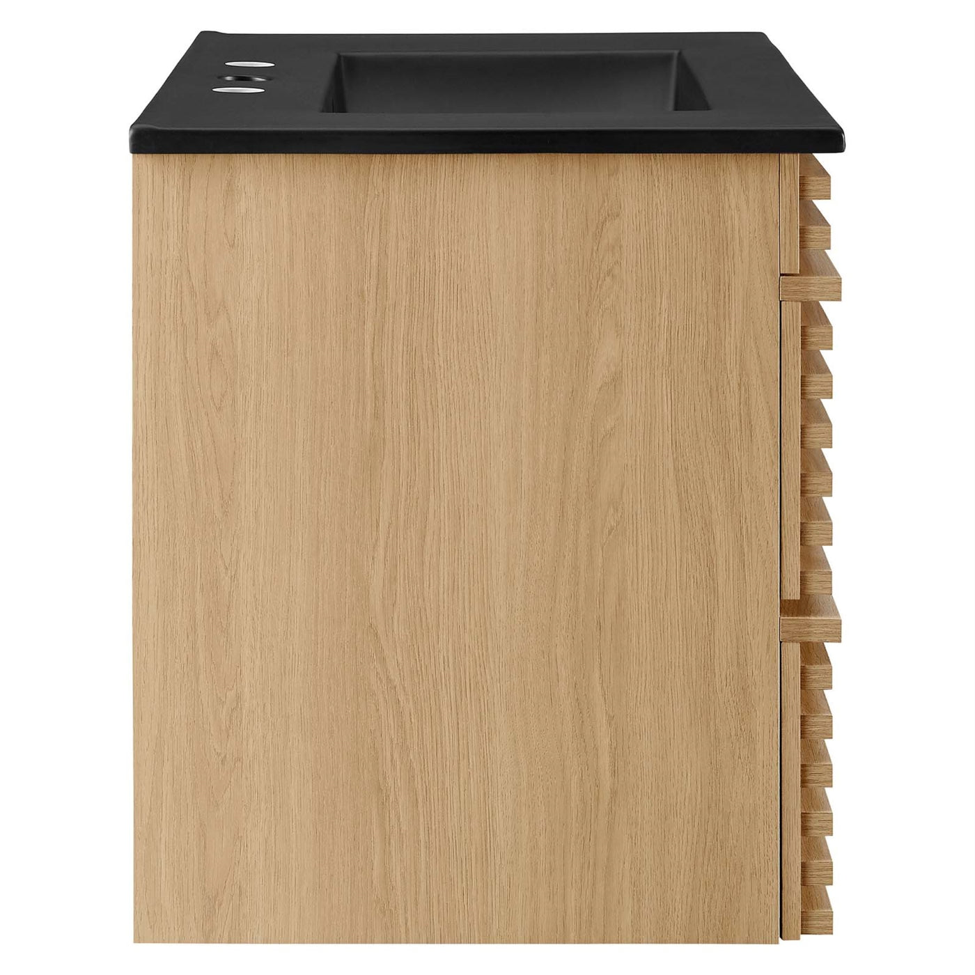 Introducing the Ergode Vanity, a perfect fusion of mid-century aesthetics and practical functionality. This 30'' Bathroom Vanity showcases a robust MDF and particleboard frame adorned with a sleek walnut grain laminate. It offers generous storage space with two full-extension drawers and a space-saving wall-mount design. The vanity features a ceramic sink with an integrated countertop, 8'' centerset faucet holes, and a rectangular basin, maintaining its retro modern appeal. With its clean lines and crisp design, this edgy style vanity is tailored to meet your needs. It boasts a solid construction and pleasing look, capturing the essence of mid-century modern style. Please note that assembly is required and fixtures are not included. The set includes one 30'' ceramic basin top and one 30'' wall-mounted vanity cabinet.
