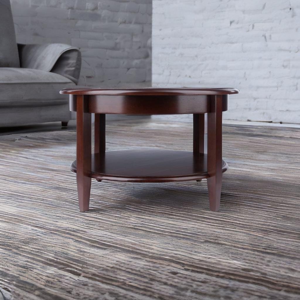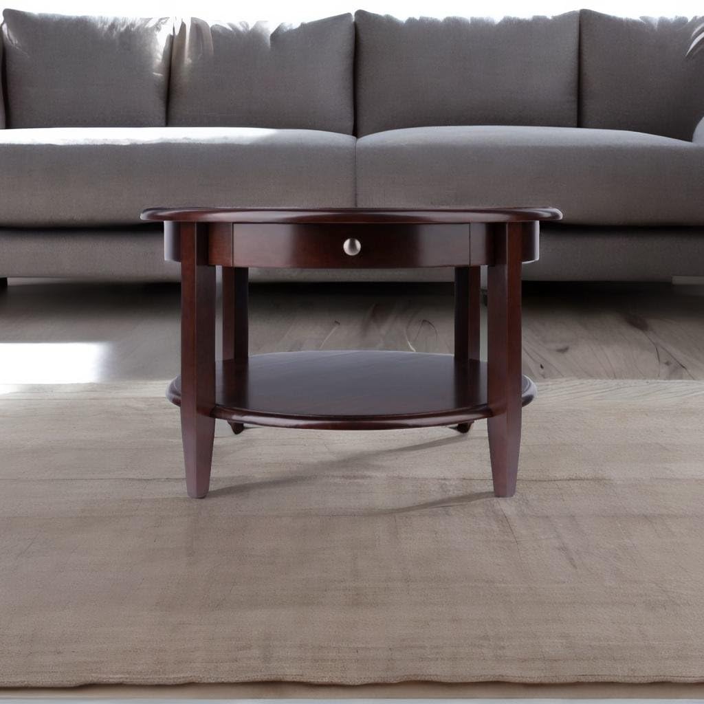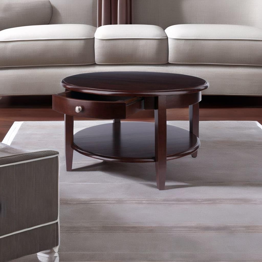 The Ergode Wood Concord Coffee Table is a durable and timeless piece of furniture. Made from solid wood and veneer, it boasts a classic walnut finish that effortlessly complements any decor. With its 30-inch diameter, this compact yet stylish table provides ample space for decorations and features an additional shelf underneath for discreet storage. It also includes a hidden drawer for storing small accessories, keys, pens, or remote controls. For a cohesive living area, consider pairing this table with other items from the Ergode Concord collection (sold separately). The table is conveniently packed in one box and comes with all necessary assembly hardware. In case any parts require replacement, you can contact the manufacturer within 60 days of purchase. Dimensions: 30" W x 30" D x 18" H, Weight: 35.27 lbs.