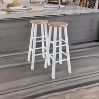 Enhance the sophistication of your kitchen, breakfast nook, or den with the Ergode Wood Element Bar Stool Set. The seat is coated with a clear lacquer, beautifully showcasing the natural wood grain. The white frame seamlessly combines modern and traditional design elements. Crafted from durable solid wood, these stools are built to last and effortlessly complement any decor. With sturdy square legs and a round seat, they provide a strong foundation and can support up to 220lbs. The stools feature 8 crossbars on all sides, serving as footrests and enhancing stability. They are perfect for extra seating, accommodating guests, and everyday use. Measuring 13.58"W x 13.58"D, they can be conveniently stored when not in use. The Element collection offers a variety of finishes and is available in both bar and counter height options. The stools are conveniently packed in one box and require minimal assembly. Overall size: 13.5" x 13.5" x 29"H. Weight capacity: 220 lbs. Ships in 1 box. Some assembly required. Dimensions: 13.58" W x 13.58" D x 28.98" H. Weight: 19.2 lbs.