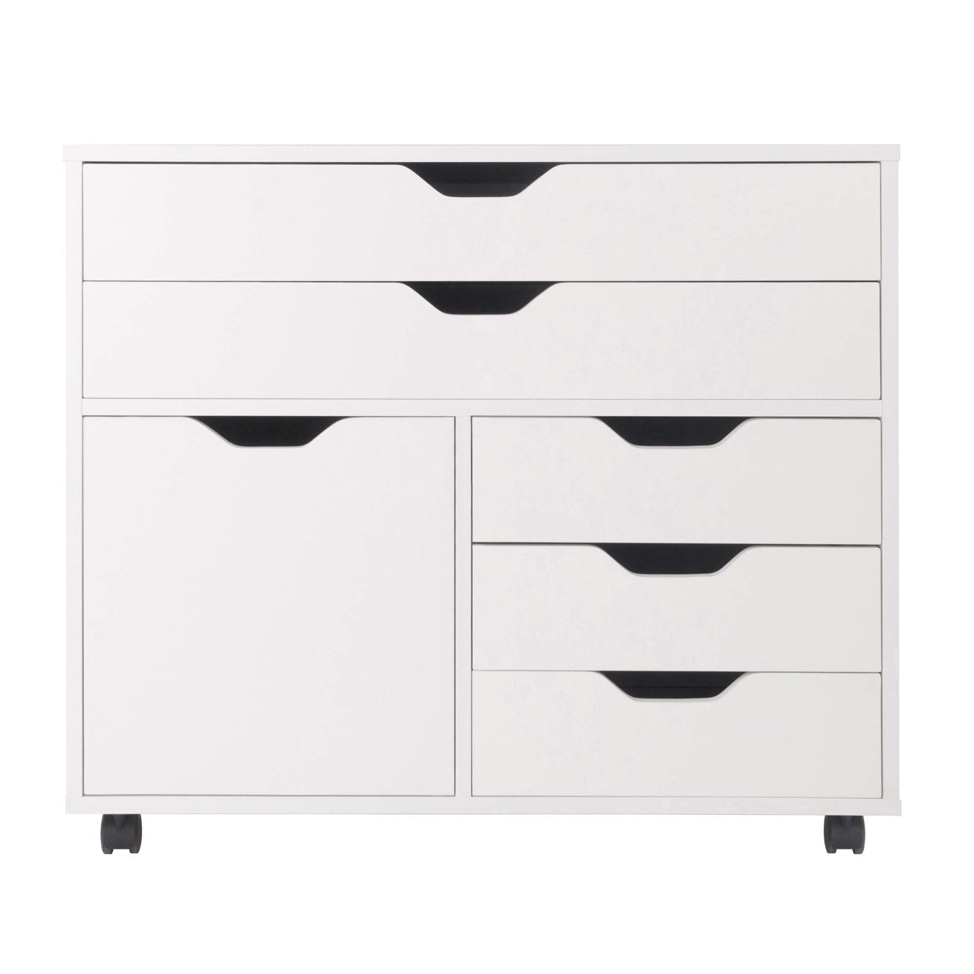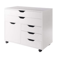 The Ergode Wood Halifax 3-Section Mobile Storage Cabinet is a versatile storage solution suitable for various settings. Its sleek design allows for easy placement in any room, making it perfect for organizing knitting, sewing, or craft supplies. It can also be used in the garage, mud room, or shed to keep tools and sports gear organized. In a walk-in closet, it provides additional storage for clothing, linens, and accessories. The cabinet features five drawers with cut-out handles for easy access. The large drawers are ideal for flat items like artwork or clothing, while the smaller drawers provide extra storage space. The side cabinet is suitable for taller items like boots or backpacks. The cabinet is equipped with five wheels, two of which can be locked for stability. It is made of sturdy composite wood with a white finish. For more storage options, it can be combined with other organizers from the Ergode Halifax collection. The cabinet requires assembly and ships in one box. Replacement parts can be requested from the manufacturer within 60 days of purchase. The overall dimensions are 26.3"H x 30.7"W x 15.9"D, and the top can hold up to 35 lbs. The large drawers have interior dimensions of 27.5"W x 11.7"D x 2.5"H with a weight capacity of 15 lbs. The small drawers have interior dimensions of 13.2"W x 11.7"D x 2.5"H with a weight capacity of 12 lbs. The cabinet has interior dimensions of 13.7"W x 14.7"D x 13.6"H with a weight capacity of 25 lbs.