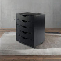 Introducing the Ergode Wood Halifax 5-Drawer Cabinet, a versatile storage solution for any room in your home. Its sleek design is perfect for decluttering your craft room, kitchen, or kids' room. The easy-open cutout pulls on the multiple drawers provide convenient storage, while the four casters (two of which can be locked) allow for easy mobility. The vertical design saves floor space, making it ideal for walk-in closets. Each drawer has a weight capacity of 20lbs and is finished in black with white interiors for easy item retrieval. Made of solid beech wood and composite materials, this cabinet is durable and long-lasting. Pair it with other organizers from the Ergode Halifax collection for additional storage options. The cabinet comes in one box with all the necessary hardware for assembly. Replacement parts can be requested from the manufacturer within 60 days of purchase. The cabinet's dimensions are 19.21" W x 15.98" D x 26.3" H, and it weighs 40.3lbs. Stay organized with the Ergode Wood Halifax 5-Drawer Cabinet.