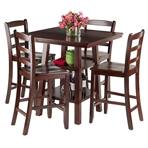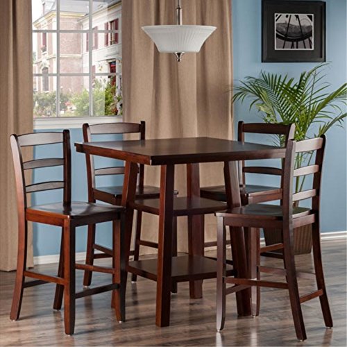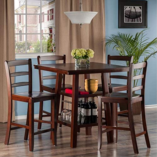 The 5-piece Orlando High Table and Ladder Back Stool Set combines simplicity and function, reminiscent of a country home antique. The set is a great addition to a dining area, eat-in kitchen, or family room for cards and board games.Or pull up one of the stools and use the table as a desk or workspace. The table features 2 shelves that offer generous storage space for dishes, glassware, and other dining accessories. The solid wood Ladder Back Stools give the set a warm and homey character. Finished in a rich Walnut, the table is made of solid and composite wood for long-lasting stability. Overall table size is 33.8"W x 33.8"D x 36"H. The Orlando High Table features two open shelves with corner cut outs for secure construction and a handcrafted look. The slightly flared legs provide added stability. The edges of the table top are gently rounded. The 24"H stools have curved backs and molded seats for comfort and tuck easily under the table to save space. Assembly required. Overall table size is 33.8"W x 33.8"D x 36"H Top shelf is 17.1"W x 17.1"D(14.1" from inner leg to inner leg) Lower shelf is 19.1"W x 19.1"D(16.1" from inner leg to inner leg) Stools are 24"H Ships in 3 boxes . Dimension: 33.86" W x 33.86" D x 36.06" H, Weight: 52.91