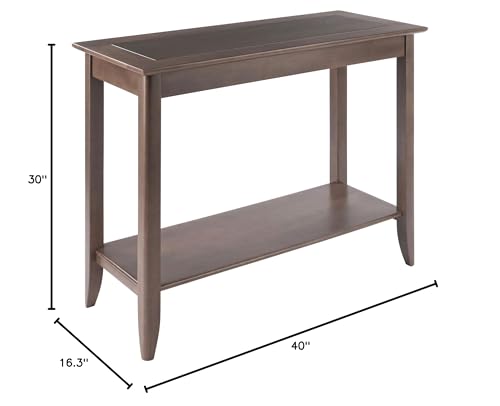 Balance and impeccable taste define the Ergode Wood Santino Console Table. Crafted in a contemporary oyster gray, and featuring a wood inlay in a darker gray tone that adds depth and distinction all while creating a sense of warmth, providing a welcome place to drop off your keys, briefcase, or handbag when you walk through the front door. A wide lower shelf provides ample space for plants or photos, or for displaying your favorite décor in the dining or living room. Softly-finished edges on the tabletop and tapered legs present a simple and elegant silhouette in any room. The table frame is made of solid wood with the contrasting inlay constructed of composite wood with wood veneer overlay for long-lasting beauty and durability. Coordinate this console table with other furnishings from the Ergode Santino collection for a cohesive look throughout your home (each sold separately). Conveniently packed and shipped in 1 box that includes the hardware necessary for assembling. Replacement part request can be submitted directly to the manufacturer within 60 days from date of purchase. Overall dimensions: 30"H x 40"W x 16.3"D Shelf dimensions: 34.4-36.8"W x 10.8-13.1"D Clearance from shelf to apron: 19.5"H Static weight capacity Tabletop: 50 lbs. Shelf: 25 lbs. Assembly required Ships in 1 box . Dimension: 40" W x 16.34" D x 30" H, Weight: 29.61