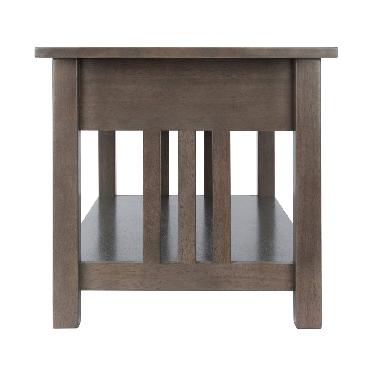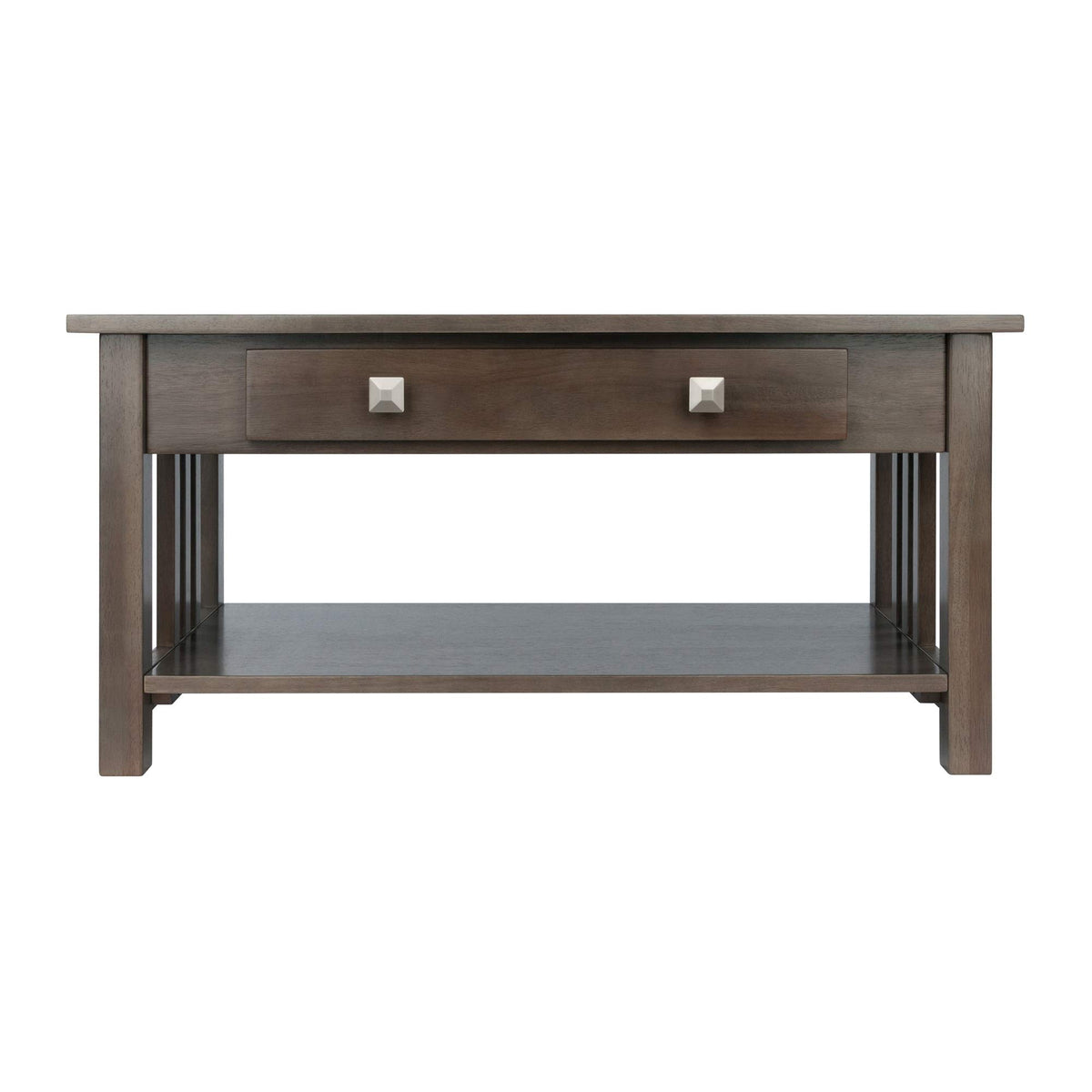 With clean line and contemporary oyster gray finish, the Ergode Wood Stafford Coffee Table makes a great complement to any decor. Mission-like slatted side panels give the table an open feel, while the rounded table edges and solid, square legs bring it down to earth as a centerpiece to your living room. Featuring a full-size drawer that is tastefully accented with two beveled silver-finish drawer pulls. Perfect for keeping remotes and other electronic devices within easy reach. A lower unit-wide shelf provides extra space for books and magazines, ample storage opportunities. Coordinate this coffee table with other furnishings from the Ergode Stafford collection for a cohesive look throughout your home (each sold separately). Constructed of solid and composite wood for long-lasting integrity. Conveniently packed and shipped in 1 box, that includes the hardware necessary for assembling. Replacement part request can be submitted directly to the manufacturer within 60 days from date of purchase. Overall dimensions: 37"W x 19.8"D x 18.1"H Shelf dimensions: 31.5"W x 17.8"D Inside drawer dimensions: 21.6"W x 12.75"D x 2.6"H Clearance from lower shelf to underneath drawer apron: 8.6"H Clearance from floor to underneath lower shelf: 3.1"H Distance between legs: 31.5"W (front), 14.4"W (side) Assembly required Ships in 1 box . Dimension: 37.01" W x 19.84" D x 18.11" H, Weight: 45.3