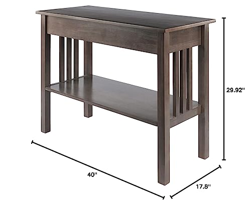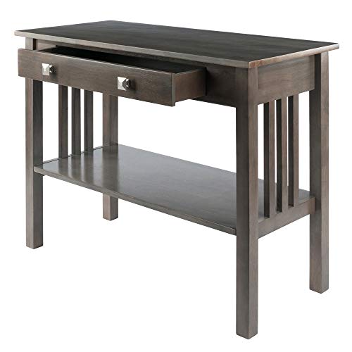 The Ergode Wood Stafford Console Table features a sleek oyster gray finish and clean lines, making it a perfect addition to any decor. It can be used as an entryway table to keep your keys and briefcase, or in the dining room or living room to display a lamp, plant, or photos. The console offers ample storage with its open shelf and unit-wide drawer. The mission-style slatted side panels and contemporary design seamlessly blend with any decor. The console table can be coordinated with other Ergode Stafford collection furnishings for a cohesive look. It is made of solid and composite wood for durability. The table is conveniently packed in 1 box with all necessary hardware for assembly. Replacement parts can be requested from the manufacturer within 60 days of purchase. Overall dimensions are 40"W x 17.8"D x 29.9"H, shelf dimensions are 34.5"W x 15.9"D, and inside drawer dimensions are 24.6"W x 12"D x 2.6"H. The table has a clearance of 12.9"H from the lower shelf to the underneath drawer apron, a clearance of 10.6"H from the floor to the underneath lower shelf, and a distance of 34.5"W between the legs (front) and 12.4"W between the legs (side). Assembly is required and the table ships in 1 box. It weighs 49.6 lbs.