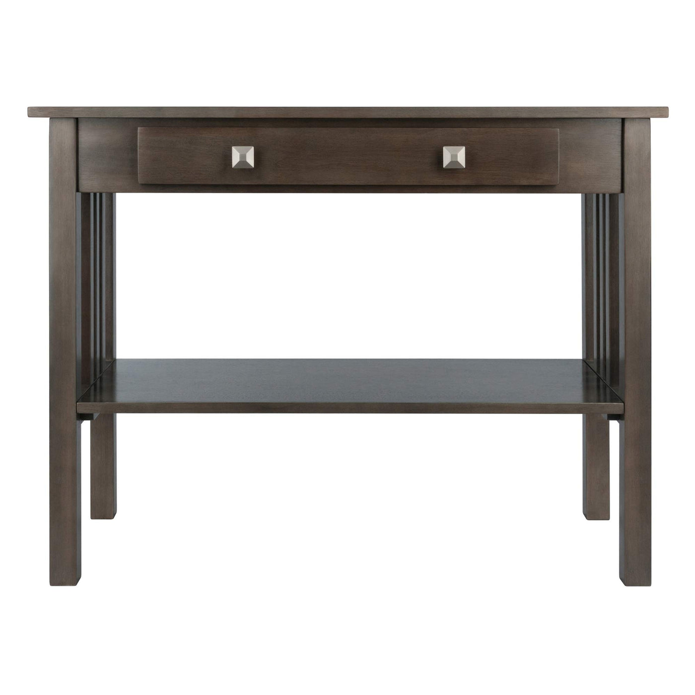 The Ergode Wood Stafford Console Table features a sleek oyster gray finish and clean lines, making it a perfect addition to any decor. It can be used as an entryway table to keep your keys and briefcase, or in the dining room or living room to display a lamp, plant, or photos. The console offers ample storage with its open shelf and unit-wide drawer. The mission-style slatted side panels and contemporary design seamlessly blend with any decor. The console table can be coordinated with other Ergode Stafford collection furnishings for a cohesive look. It is made of solid and composite wood for durability. The table is conveniently packed in 1 box with all necessary hardware for assembly. Replacement parts can be requested from the manufacturer within 60 days of purchase. Overall dimensions are 40"W x 17.8"D x 29.9"H, shelf dimensions are 34.5"W x 15.9"D, and inside drawer dimensions are 24.6"W x 12"D x 2.6"H. The table has a clearance of 12.9"H from the lower shelf to the underneath drawer apron, a clearance of 10.6"H from the floor to the underneath lower shelf, and a distance of 34.5"W between the legs (front) and 12.4"W between the legs (side). Assembly is required and the table ships in 1 box. It weighs 49.6 lbs.