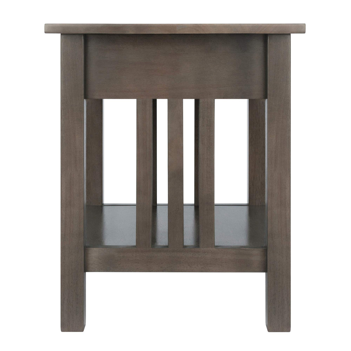 The Ergode Wood Stafford End Table is a perfect blend of classic and contemporary design, making it suitable for any decor. Its mission-like slatted side panels create an open and modern feel with its oyster gray finish. This accent table features one drawer with a beveled silver-finish pull, making it ideal for bedside use or storing personal accessories. The open lower shelf is great for keeping books and magazines. It can be used in the living room or as a printer stand in the home office. The table is made of solid and composite wood for durability. It comes conveniently packed in 1 box with all the necessary hardware for assembly. Replacement parts can be requested within 60 days of purchase. Overall dimensions are 19.9"W x 18.9"D x 22"H, with shelf dimensions of 14.4"W x 17"D and inside drawer dimensions of 8.5"W x 12"D x 2.5"H. The clearance from the lower shelf to underneath the drawer apron is 10.8"H, and the clearance from the floor to underneath the shelf is 4.9"H. The distance between the legs is 14.4"W (front) and 13.5"W (side). Assembly is required, and it ships in 1 box. The table weighs 30.86 lbs.