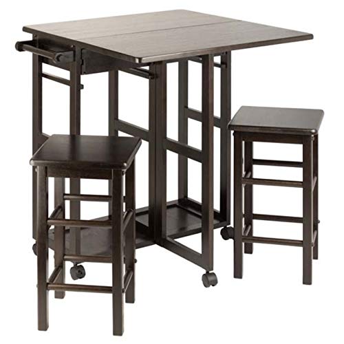 Introducing the Ergode Wood Suzanne Collection, a versatile 3-Piece Space Saver Set designed for your kitchen, breakfast nook, or den. This set offers convenience with its drop leaf and swing-away leg, transforming into a dining table for two. The hideaway stools can be neatly tucked under the table, and the unit can be rolled into a corner to maximize space. Crafted from sturdy solid wood with a coffee finish, it includes two drawers for storage. The set is easy to assemble, providing all necessary hardware. The table has a height of 32.75' and dimensions of 27.3'W x 29.6'D (leaf open) and 27.3'W x 15.4'D (leaf lowered). The stools measure 11.5'W x 11.5'D x 20.8'H and have a static weight capacity of 200 lbs each. This set is ideal for small spaces and studio apartments.