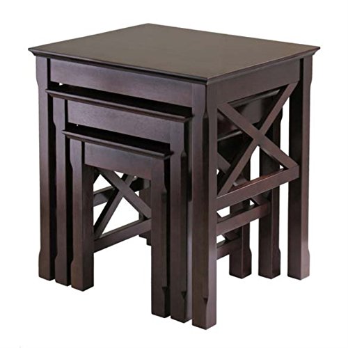 Introducing the Ergode Xola 3-Piece Nesting Table Set, a versatile and stylish addition to any room. Crafted from solid wood with a rich cappuccino finish, these tables bring both functionality and elegance to your home. The unique "X" cross design adds a contemporary touch, making them perfect for use as accent or end tables. The nesting design allows for space-saving convenience, as the three tables nest neatly within each other when not in use. This feature makes them ideal for smaller living spaces or for those who enjoy a clutter-free environment. The set includes three different-sized tables: Large Table: 21.1"W x 17.3"D x 22.1"H Middle Table: 16.5"W x 16"D x 18.5"H Small Table: 12.2"W x 14.4"D x 15"H Each table is constructed from engineered wood with a sturdy frame, ensuring durability and a maximum weight recommendation of 50 pounds. The rectangular shape provides ample surface area for displaying decor, holding beverages, or serving snacks to guests. Assembly is required, but with the included instructions, you'll have your new nesting tables ready in no time. The Ergode Xola 3-Piece Nesting Table Set is not only functional but also a beautiful addition to your home decor, blending seamlessly with various interior styles.