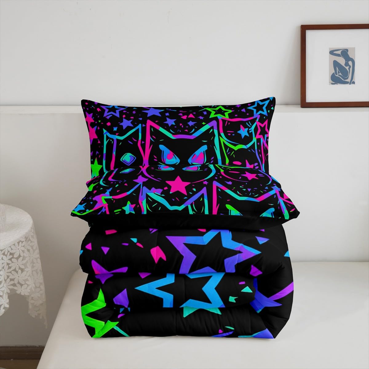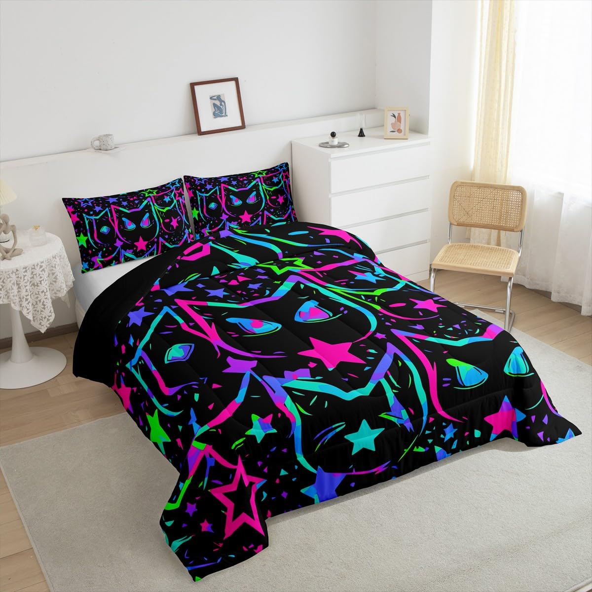 Erosebridal Halloween Cat Bedding, Black Cat Comforter Set For Kids Girls Boys Teens, Ombre Glowing Neon Stars Down Comforter, K