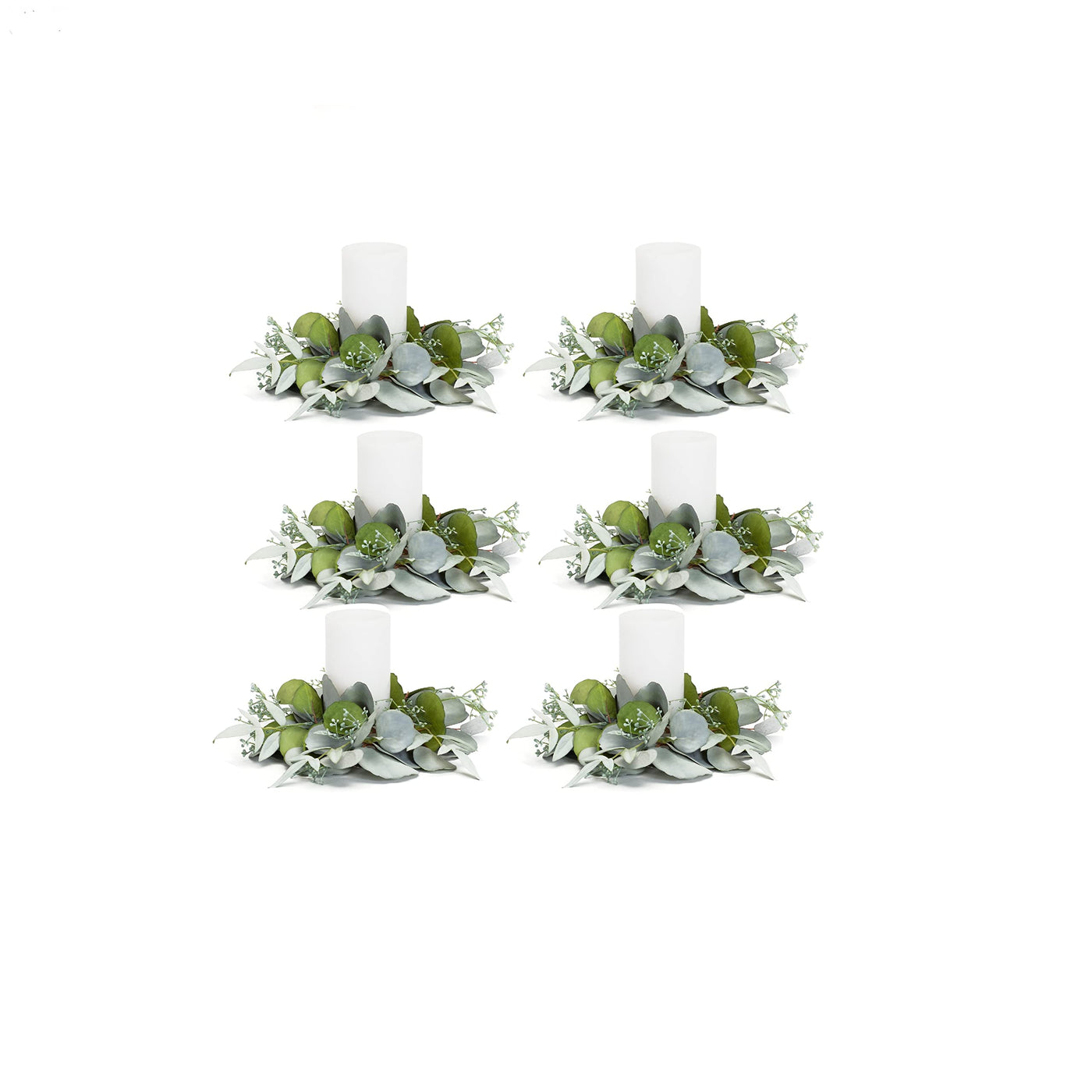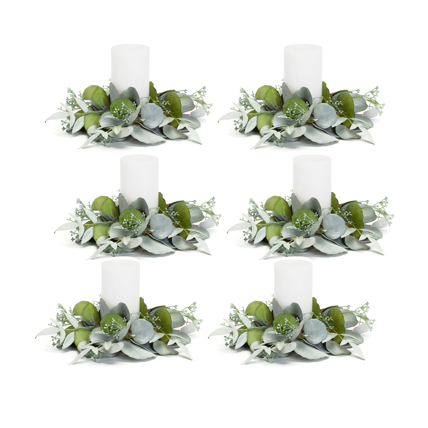 Add a pop of natural color to your holiday decor with this beautiful set of Winter Eucalyptus Candle Rings. Featuring six pieces, this set would make a great addition to your Christmas centerpiece or mantle decor. The variegated eucalyptus foliage paired with the realistic seed accents is the perfect combination to create a stunning display. Complete the look by adding a real wax or LED candle to the center of the ring.