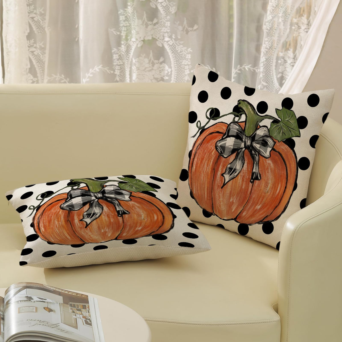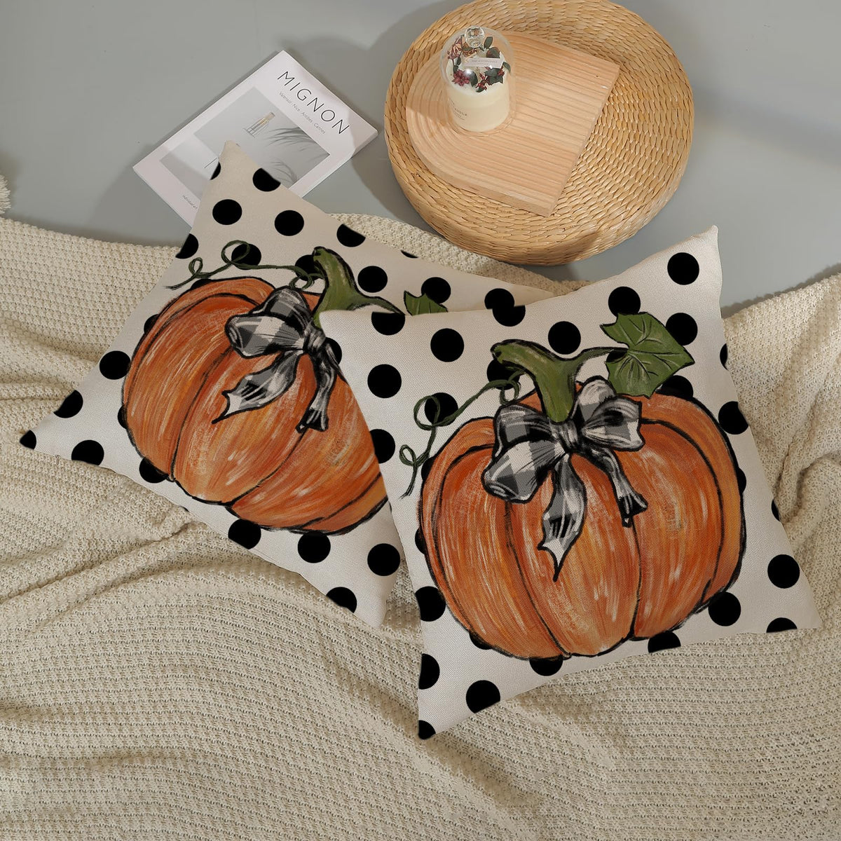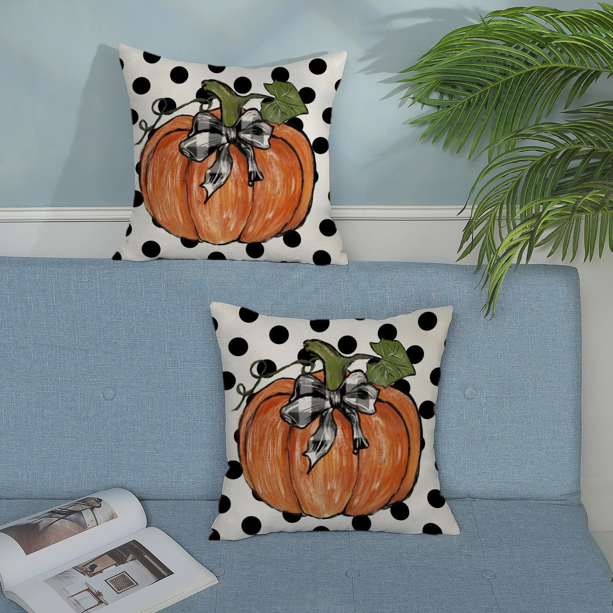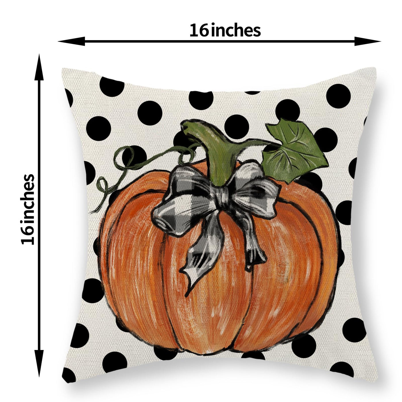 Fall Pillow Covers 16X16 Set Of 2 Pumpkin Maple Leaves And Polka Dot Fall Decor Pillowcase Linen Autumn Thanksgiving Decorative