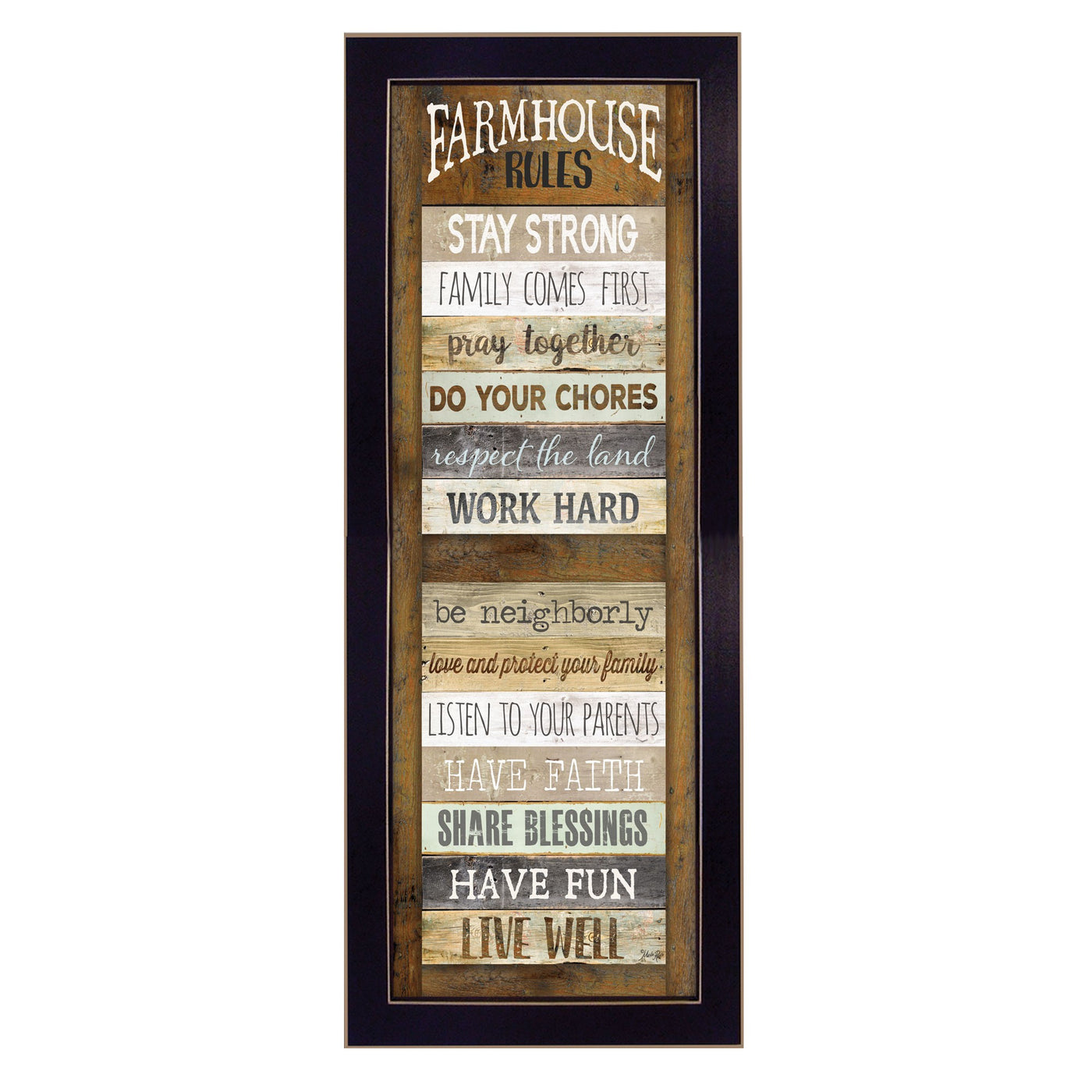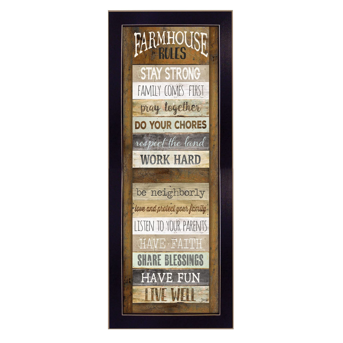 Unique and decorative, this farmhouse rules 1 black framed print wall art will leave a lasting impression. This print is a visual artistic expression that allows you to decorate your space in style. Reproduced for you on paper, this hanging accent will be a trendy and fashionable way to dress your hang on your wall to add some up to fashion date and decoration. Instantly liven up your space with this art that brings color and dimension to your wall. 38' H x 14' W x 1' D