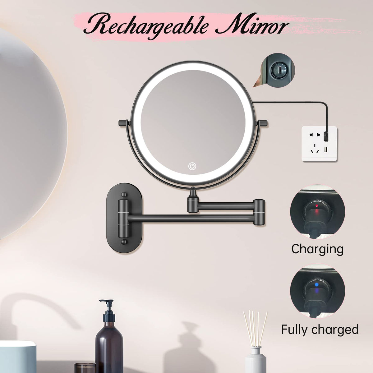 Fascinate Rechargeable Wall Mounted Lighted Vanity Mirror 8 Inch 1X/10X Magnifying Makeup Mirror With 3 Color Lights, Double Sid