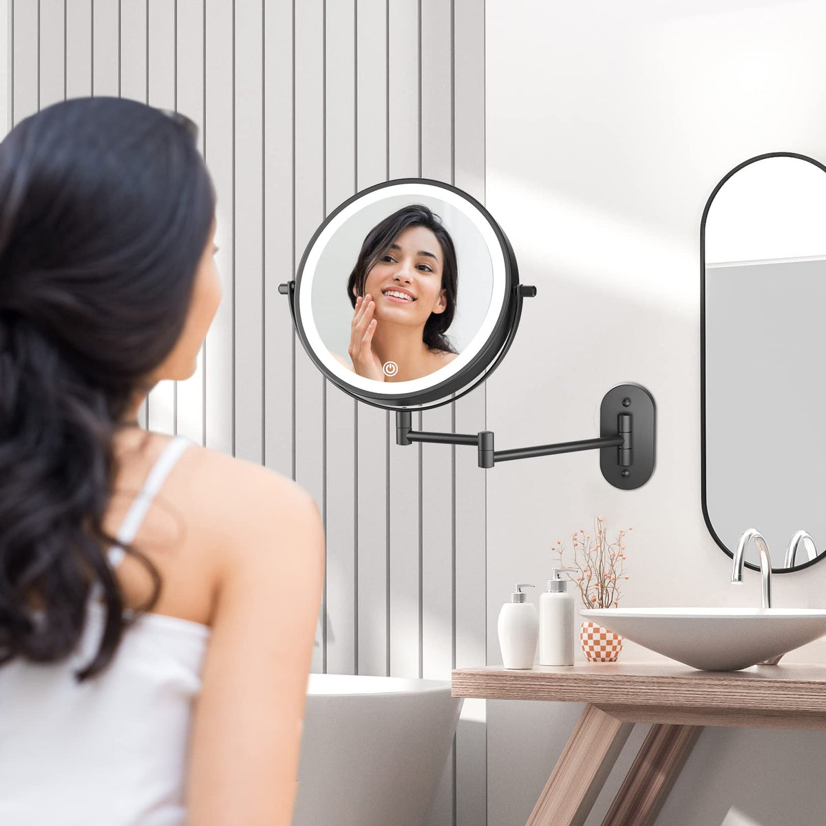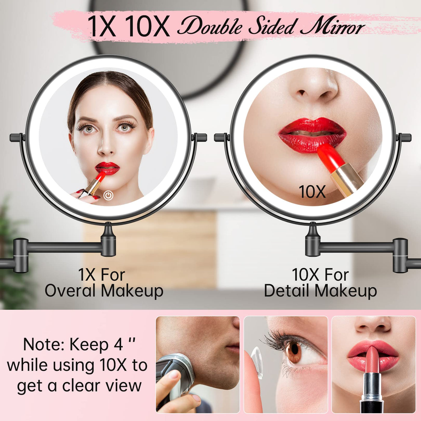 Q: What are the main features of the FASCINATE Rechargeable Wall Mounted Lighted Vanity Mirror?A: The FASCINATE mirror features an 8-inch double-sided design with 1X and 10X magnification, making it perfect for detailed makeup application and grooming. It includes three color light settings to adapt to different lighting conditions and a 360-degree screen touch for easy adjustments.
