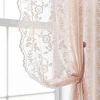 Q: What is the design style of the FINECITY Blush Lace Curtains?A: These curtains feature a delicate knitted vintage floral leaf scalloped lace pattern, designed to bring a shabby chic touch to your decor while complementing both modern and country home styles.