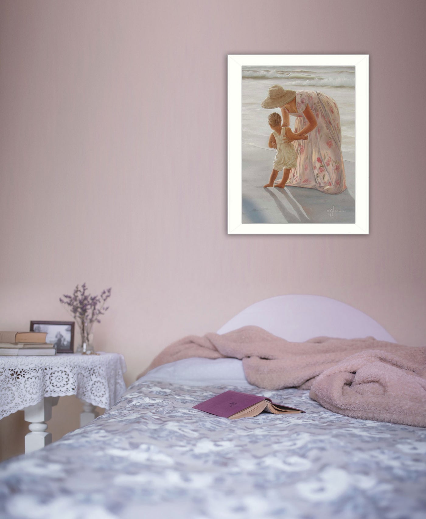 Add an air of fashion to your room and rejuvenate the space with this first time on the beach white framed print wall art. This print is a visual artistic expression that allows you to decorate your space in style. Reproduced for you on paper, this hanging decorative accent will be a trendy and fashionable way to dress your walls. Hang on your wall to add some up to date fashion and decoration. Utilize this opportunity to create a focal point in the room with this wonderful wall with this wonderful wall decor option. 14. 'H x 18' W x 1' D