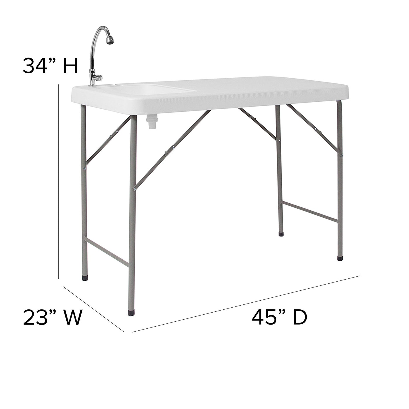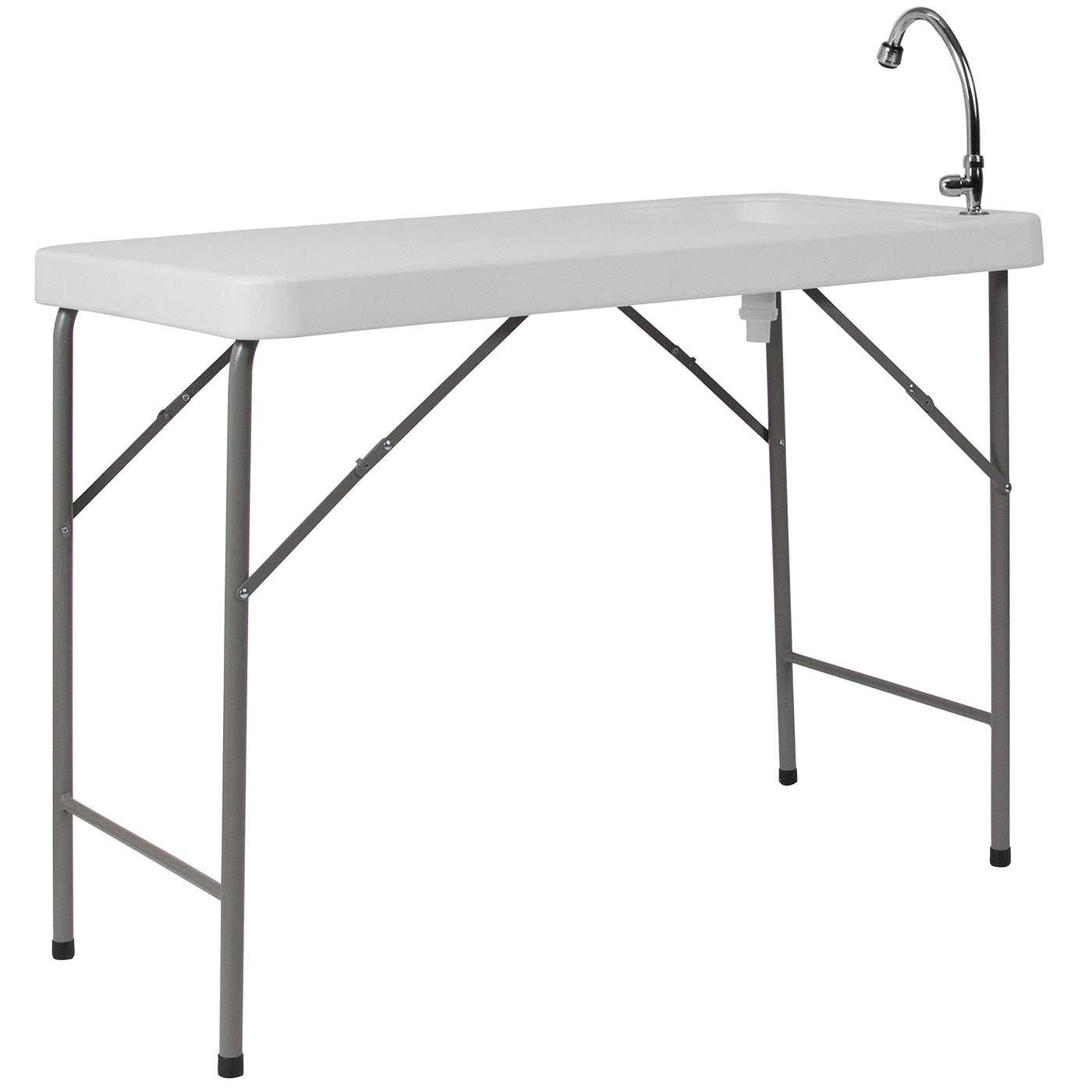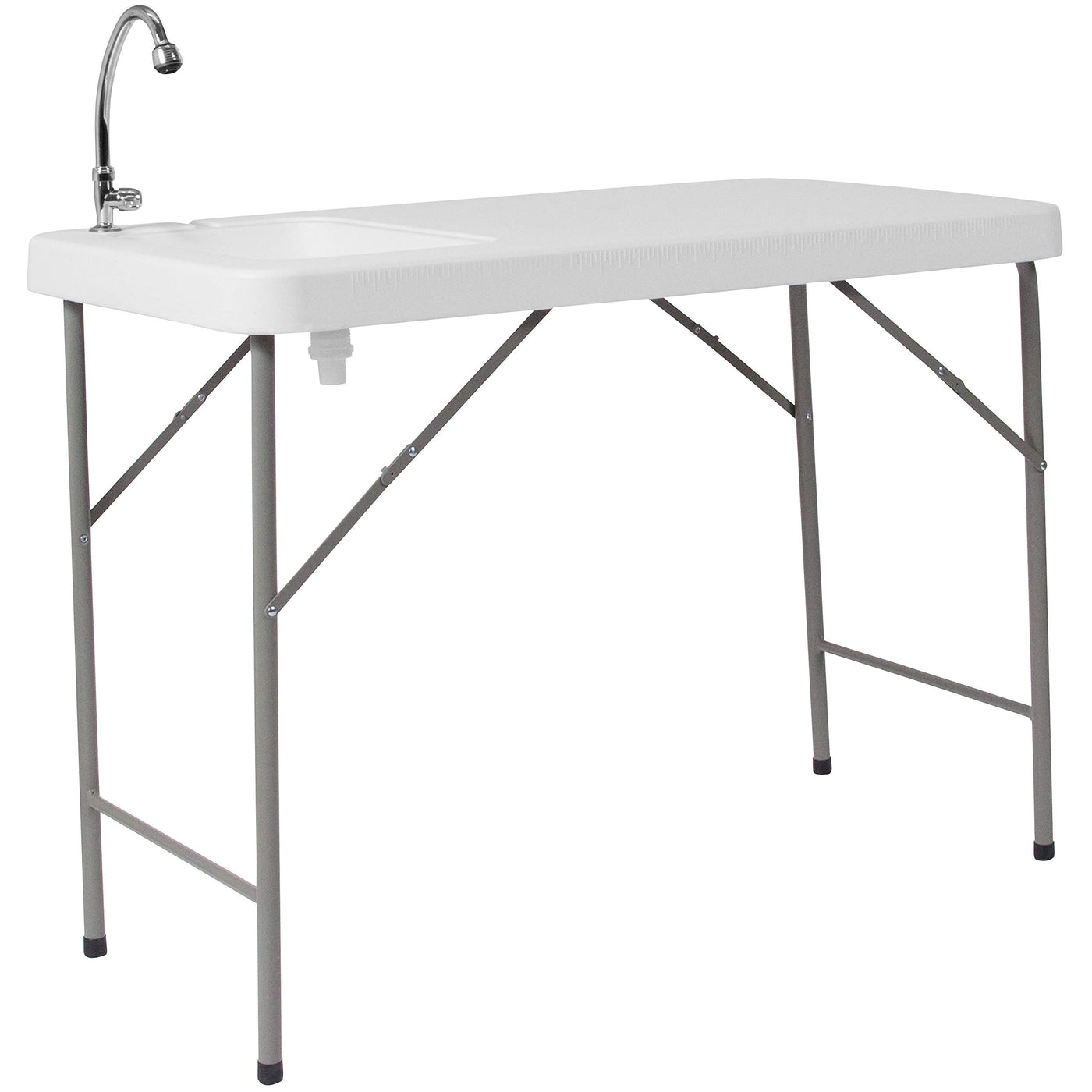 Add functionality and convenience to your fishing days with the Flash Furniture Wesley 4' Portable Fish Cleaning Table. Whether you're fishing, camping, or embarking on other outdoor journeys, this versatile fishing cleaning table makes it easy to wash your hands or clean your fish, garden vegetables, or grill equipment at home or on the road. When you're set up at your campsite and enjoying your time outdoors with friends and family, you won't need to worry about having to go inside the RV when you have this outdoor table by your side. The built-in sink makes it easy to clean your catch right away or tidy up before a meal, and it comes with a drain stopper, faucet, and hose attachment for ease of use. With a highly efficient design, you can set up this table without a hassle on your campsite or boat and then fold the convenient foldable legs under the table for easy portability and compact storage in between uses. This portable camping table measures 23"W x 45"D x 34"H with a 11.50"W x 16.25"L x 3"H sink size to make for an excellent prep and cleaning station you can use on all your outdoor excursions!