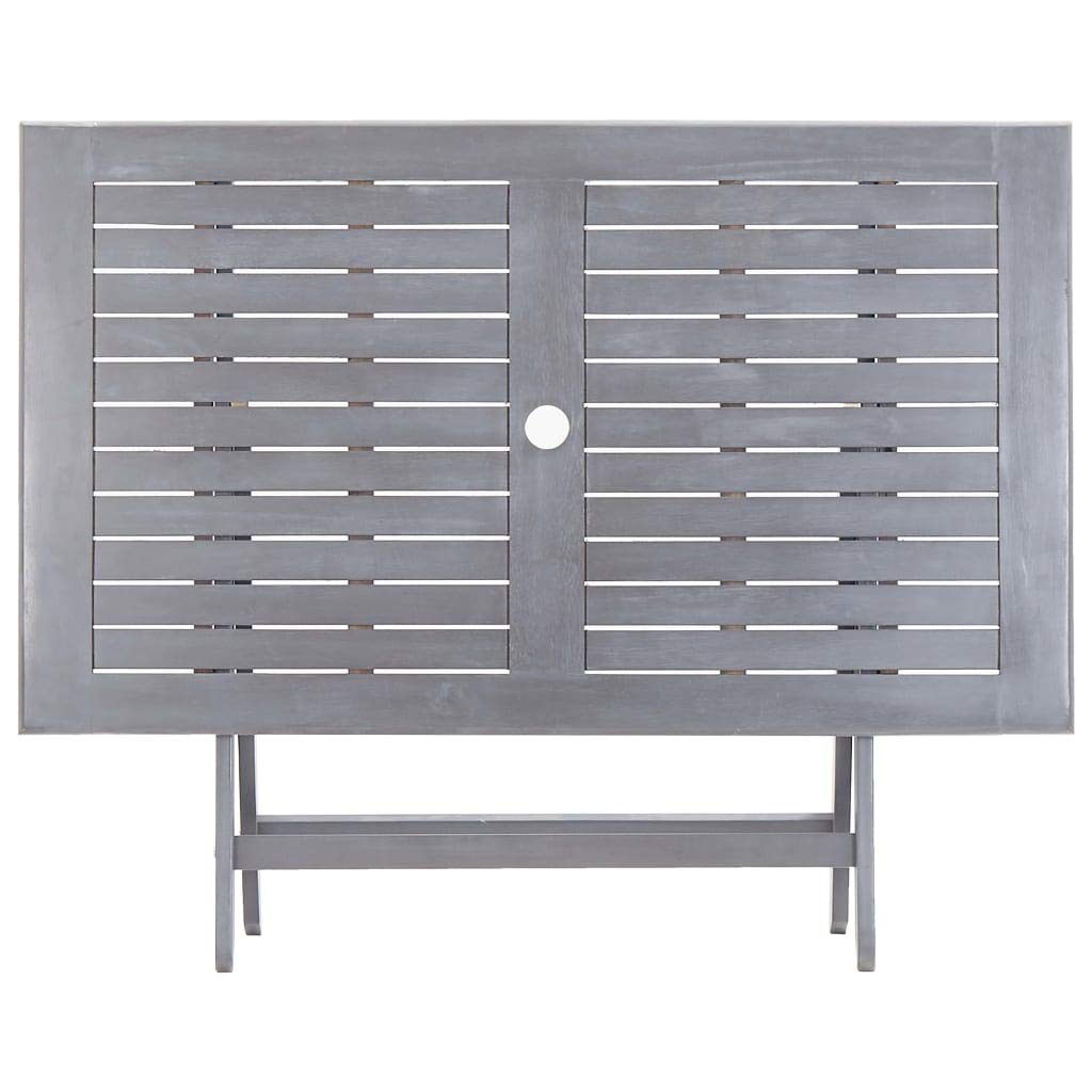 Enjoy a nice meal outdoors with your family and friends around our garden table! The wooden table will bring a touch of rustic charm to your patio, garden or terrace. The outdoor dining table is made of solid acacia wood, a tropical hardwood, which is weather-resistant and highly durable. It features a hole for holding a parasol firmly in the middle. The outdoor table can be folded away to save space when not in use. The dining table needs assembly.Material: Acacia hardwood with a grey washDimensions: 120 x 70 x 75 cm (L x W x H)Foldable