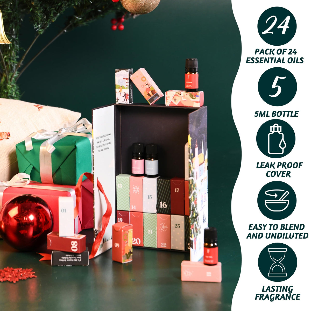 Q: How do I use the essential oils in the Advent Calendar?A: To use the essential oils from the Advent Calendar, simply add a few drops to your diffuser, following the manufacturer's instructions for optimal results and to enjoy the captivating scents throughout your home.