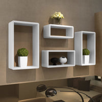 Our Wall Shelf Set offers a really attractive and contemporary way to display your ornaments or store your books or DVDs. Easy to position on the wall, you can mount them separately or grouped together. They really will turn a dull wall into a feature and are suitable for any room in the home. They can be either mounted on your wall or just piled up on the floor for your display and storage use. And thanks to its free standing / dimension design, each unit can be placed vertically or horizontally as you wish.These white units are made of quality MDF with high gloss finish. Delivery includes 4 x cuboid shelves with all the assembling accessories in need.