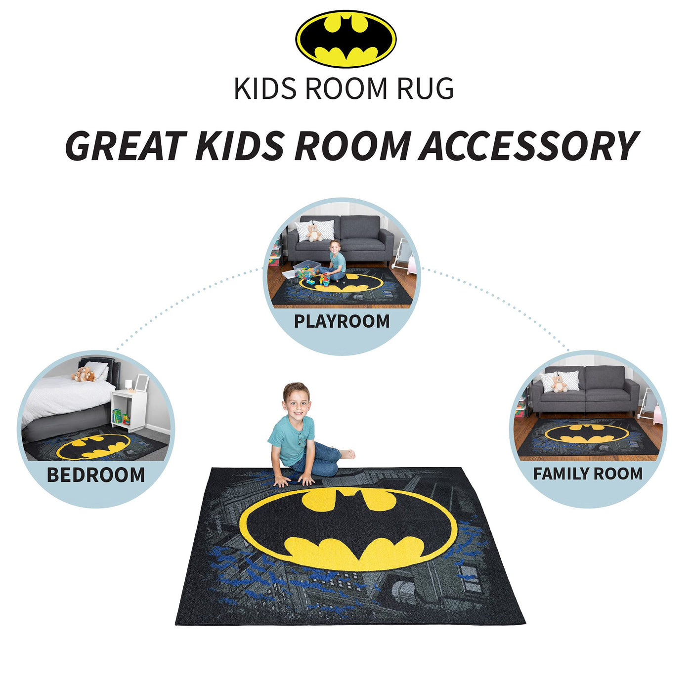 The Bat Symbol Pops Against A Gotham City Backdrop On This Cool And Colorful Childrens Area Rug. Featuring Batmans Classic Black, Yellow, Blue And Grey Color Scheme, The ''Bat View'' Pattern Of This High Quality Rug Brings The Animated Look Of The Popular Warner Bros. Character Into Your Childs Bedroom, Playroom Or Any Space That Could Use Some Superhero Style.This Batman Area Rug Is Made From A Durable 100% Nylon Material That Will Stand Up To Everyday Use While Resisting Pilling. Binding Around The Edges Also Adds Durability By Helping The Rug Maintain Its Shape And Prevent Fraying. Kids Will Love Having The Iconic Bat Symbol Underfoot As They Imagine A World Of Crime-Fighting Adventure. With Its Colorful Design And Bold Character Artwork, This Area Rug Makes A Great Gift That Adds Standout Style To Any Space.Batman Continues To Entertain And Inspire A New Generation Of Superhero Fans With His Bravery And Style. Now Kids Can Bring The Excitement Of Gotham City Home With This Soft And Stylish Bat Symbol Area Rug.