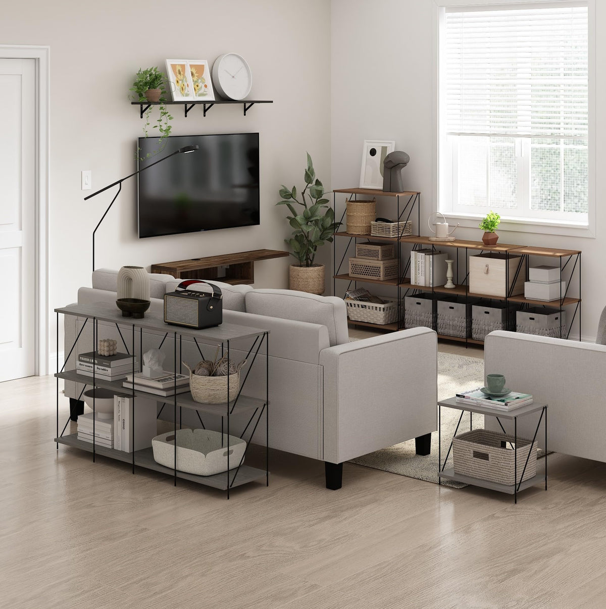 Furinno Besi Industrial Multipurpose Shelf Display Rack is the perfect addition to your home to showcase an on-trend style and satisfy your needs. The industrial-style shelf is designed with a minimalist feel that can easily blend in any room setting and showcase your collectibles, favorite books, succulents, family photos, and more. This attractive shelf comes with multiple color options and fully utilized the vertical space in your home. The shelf is made of durable CARB Grade composite wood and metal frame to solidify the shelf. Each shelf can hold up to 20 lbs. Assembly is easy with clear step-by-step assembly instructions and a hardware pack provided. Care instructions: wipe clean with a clean damped cloth. Avoid using harsh chemicals. Pictures are for illustration purposes. All decor items are not included in this offer.