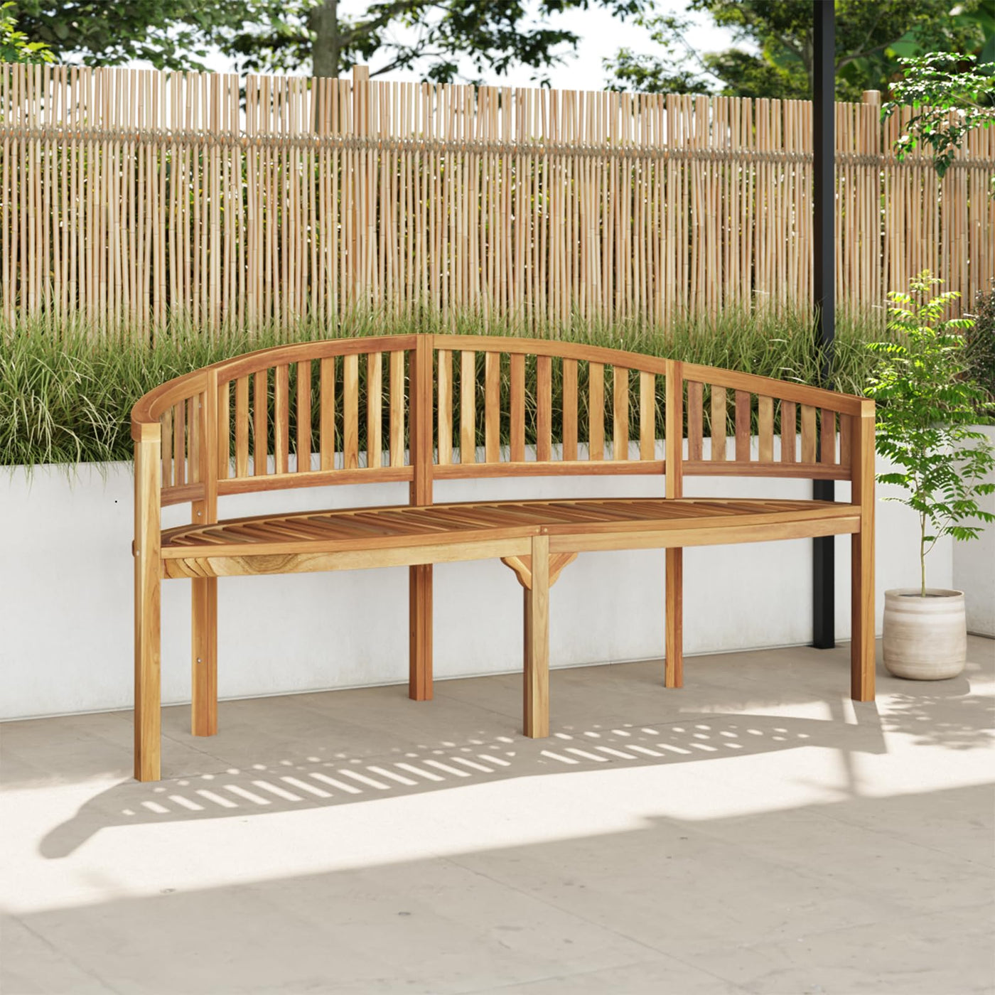 This stylish banana-shaped wooden bench is comfortable and will add a touch of sophistication and elegance to your garden, patio or living room.Constructed from extremely durable teak hard wood, this piece of teak furniture has been seasoned, kiln dried and then fine sanded to give a very smooth appearance. Teak wood is known for its exceptional strength and weather resistance, making it far more suitable for garden furniture than any other kind of wood. Teak wood is the perfect choice if you want to purchase a long lasting piece of garden furniture. The solid teak garden seat requires very little maintenance and care. This wooden bench will be a great choice for relaxing outdoors or indoors.