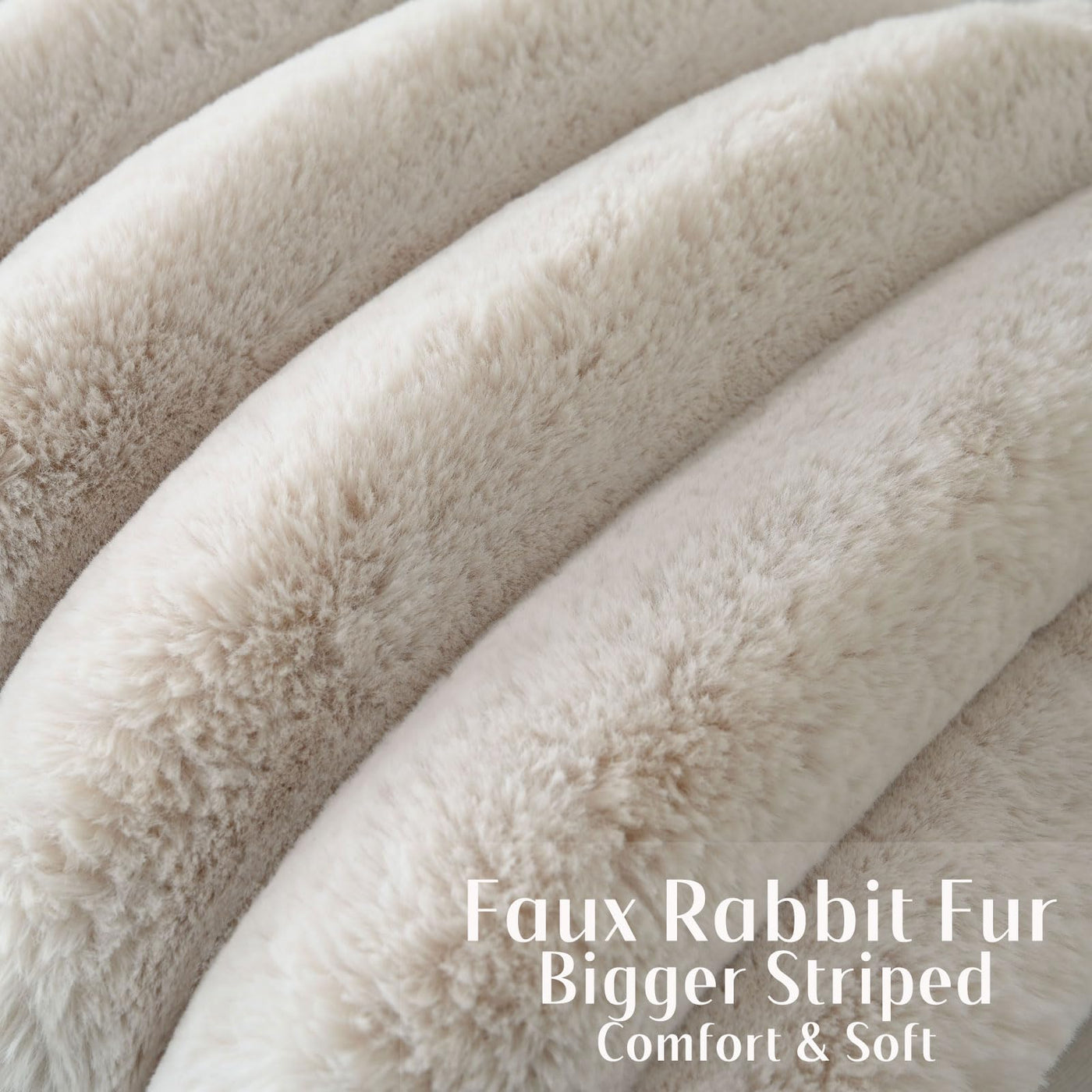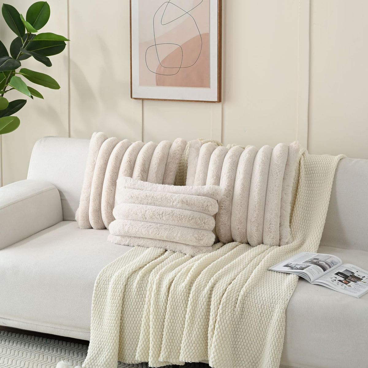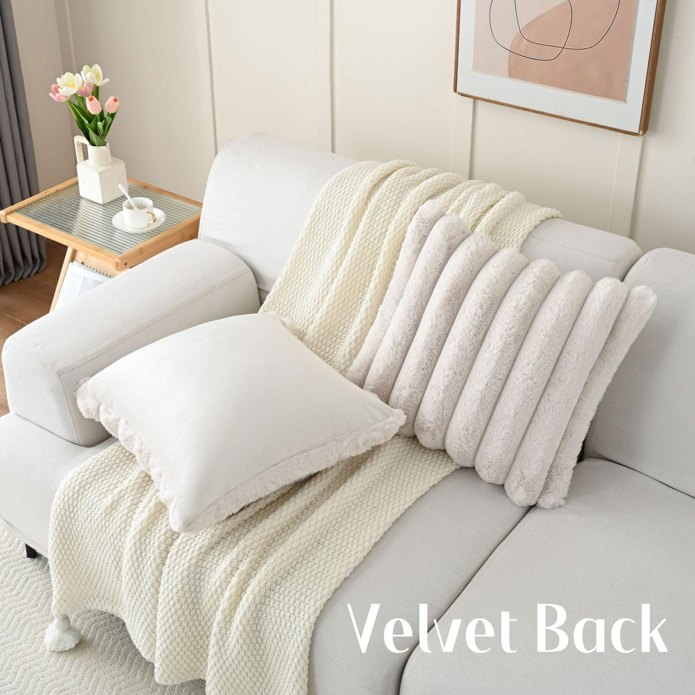 Futei Beige Decorative Throw Pillow Covers 16X16 Inch Set Of 2, Square Soft Faux Rabbit Fur Big Striped Cushion Cover,Home Decor