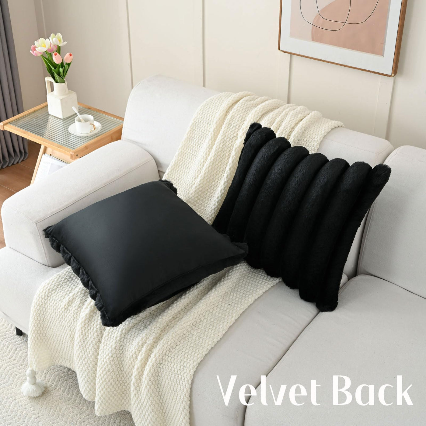 Futei Black Decorative Throw Pillow Covers 20X20 Inch Set Of 2, Square Soft Faux Rabbit Fur Big Striped Cushion Cover,Home Decor